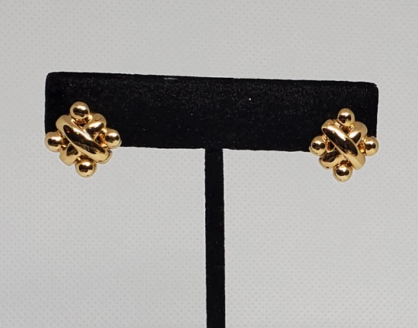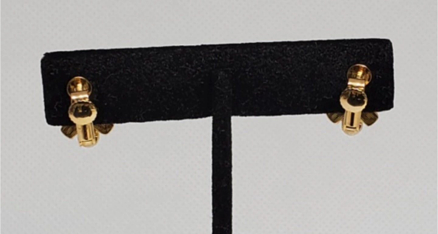 Gold tone clip on earrings. The earrings are in good condition. There are no chips, cracks, or tarnish. They are a classic style and will look great with any outfit.