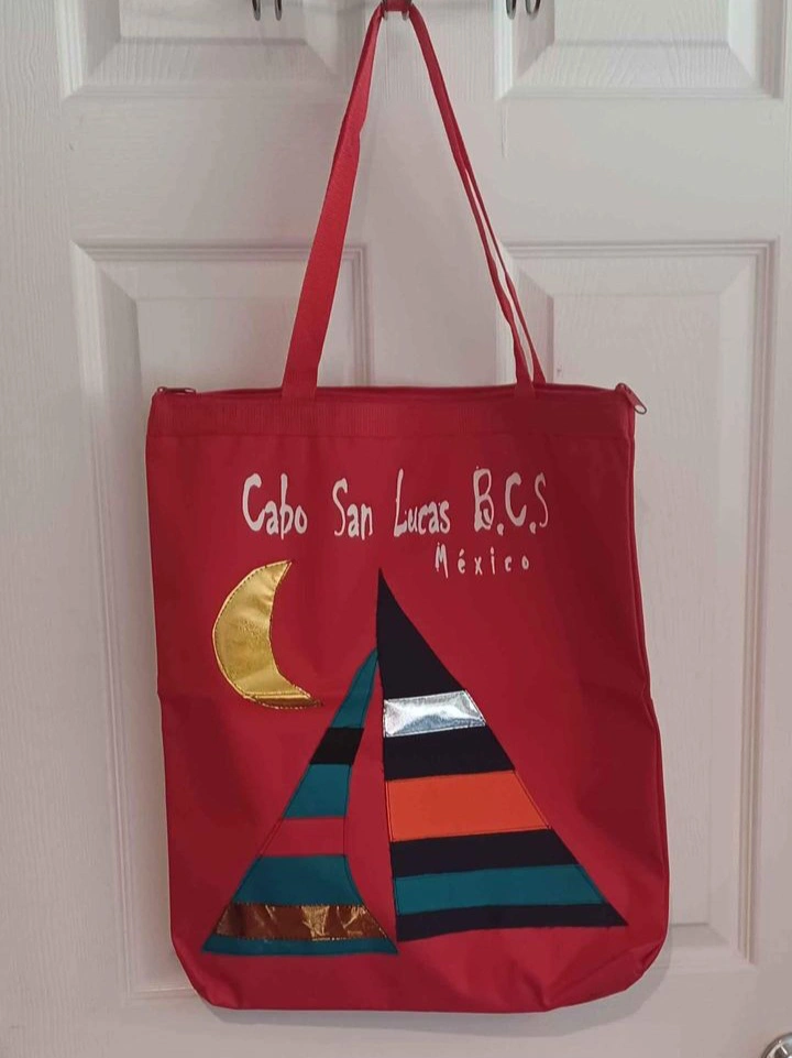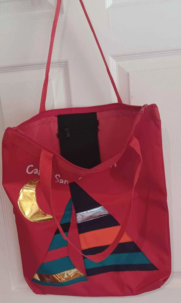 486Red tote bag with a sailboat and moon design. It has a zipper closure and a small zippered pocket on the inside. Dimension 19'x16 inches Never used.