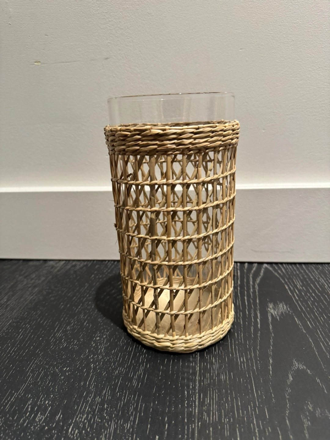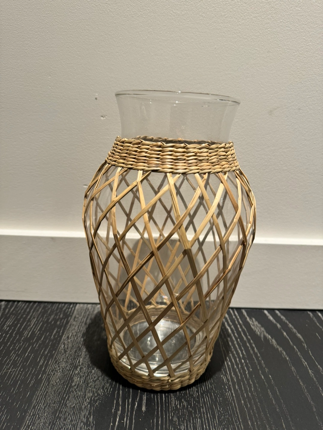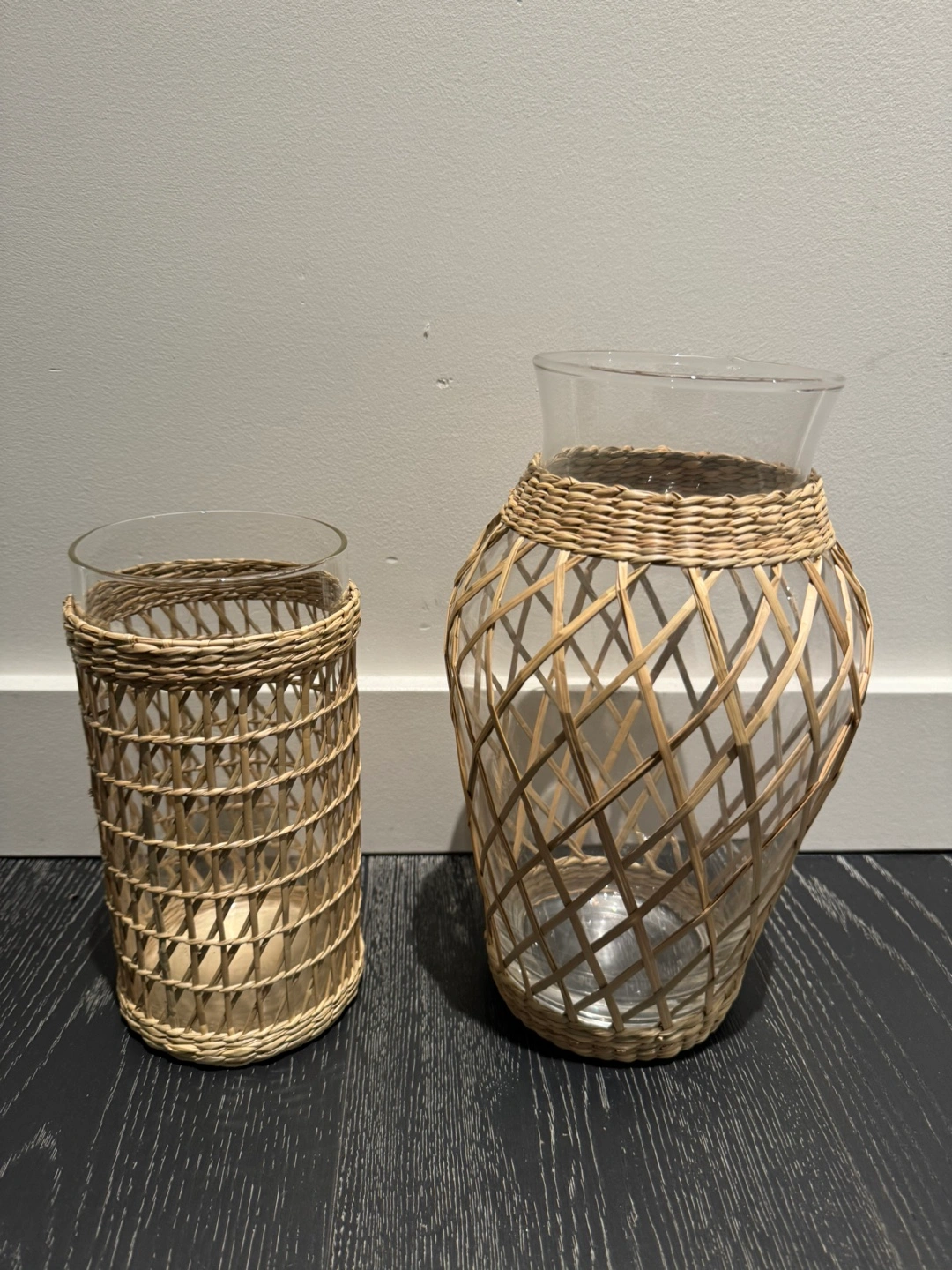 Set of two clear glass vases with woven wicker detailing. Great for a modern farmhouse decor theme. One vase is taller and wider than the other. Tallest vase is approximately 25cm tall.