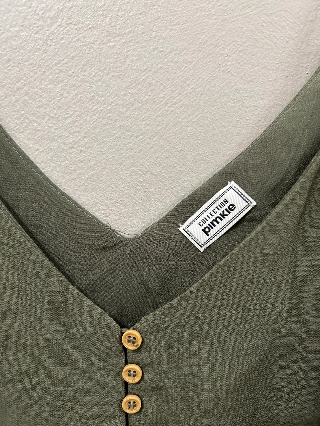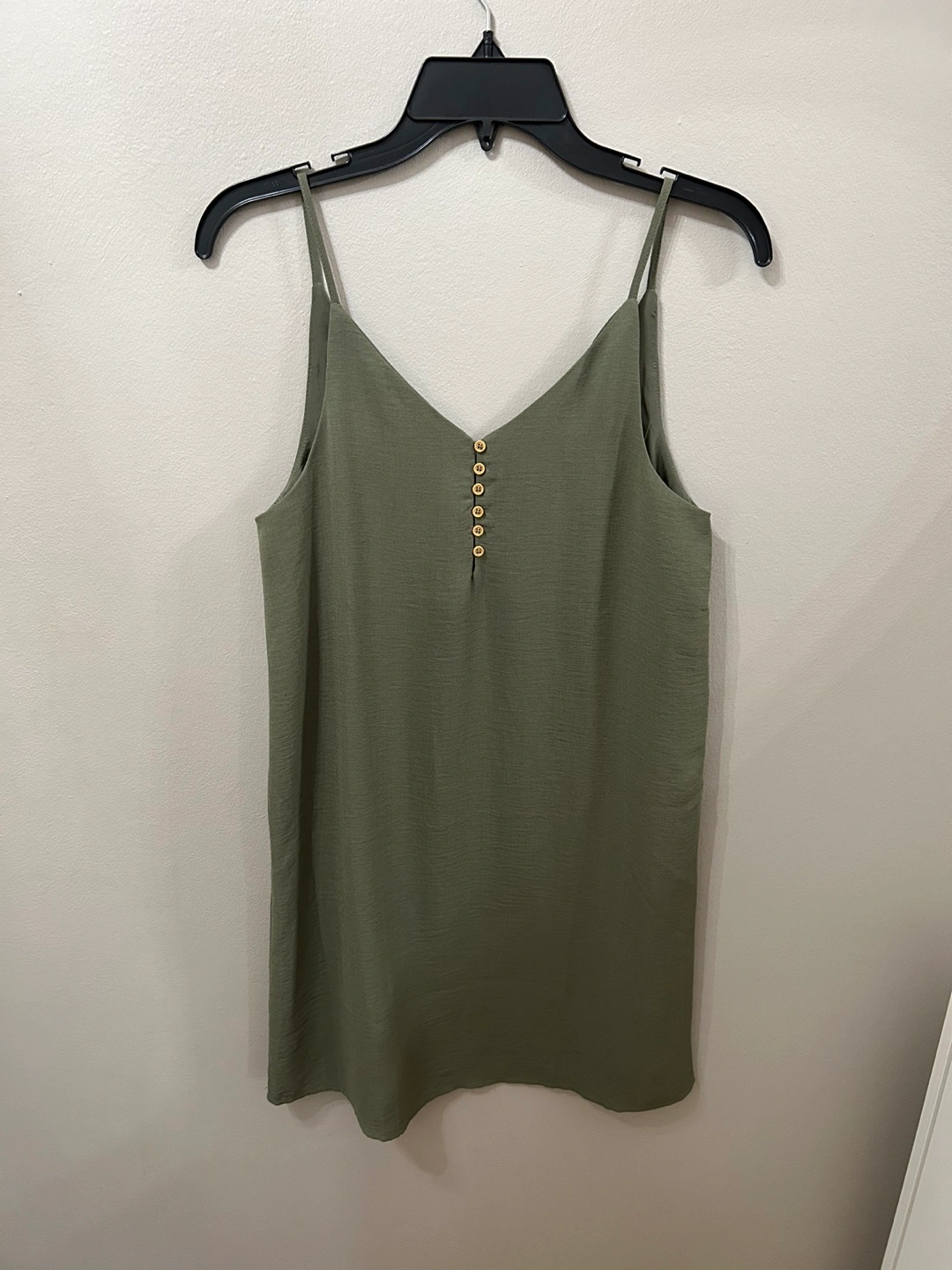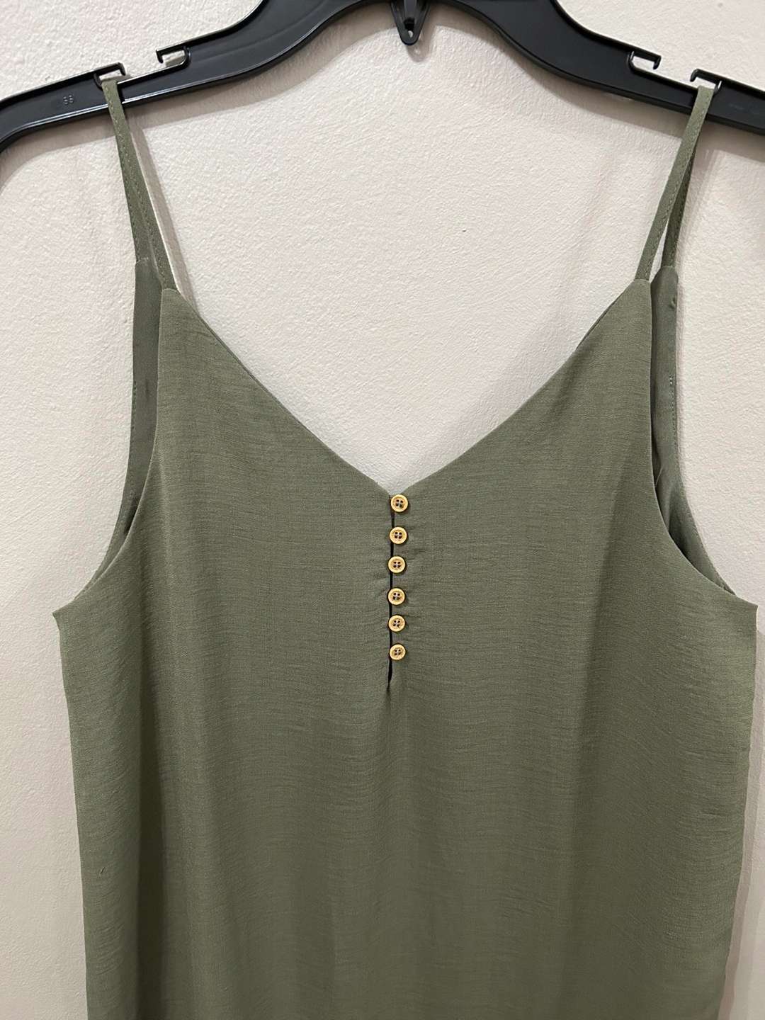 Green sleeveless midi dress. Button detailing in the front. V-neck. Spaghetti straps. Lightweight material.