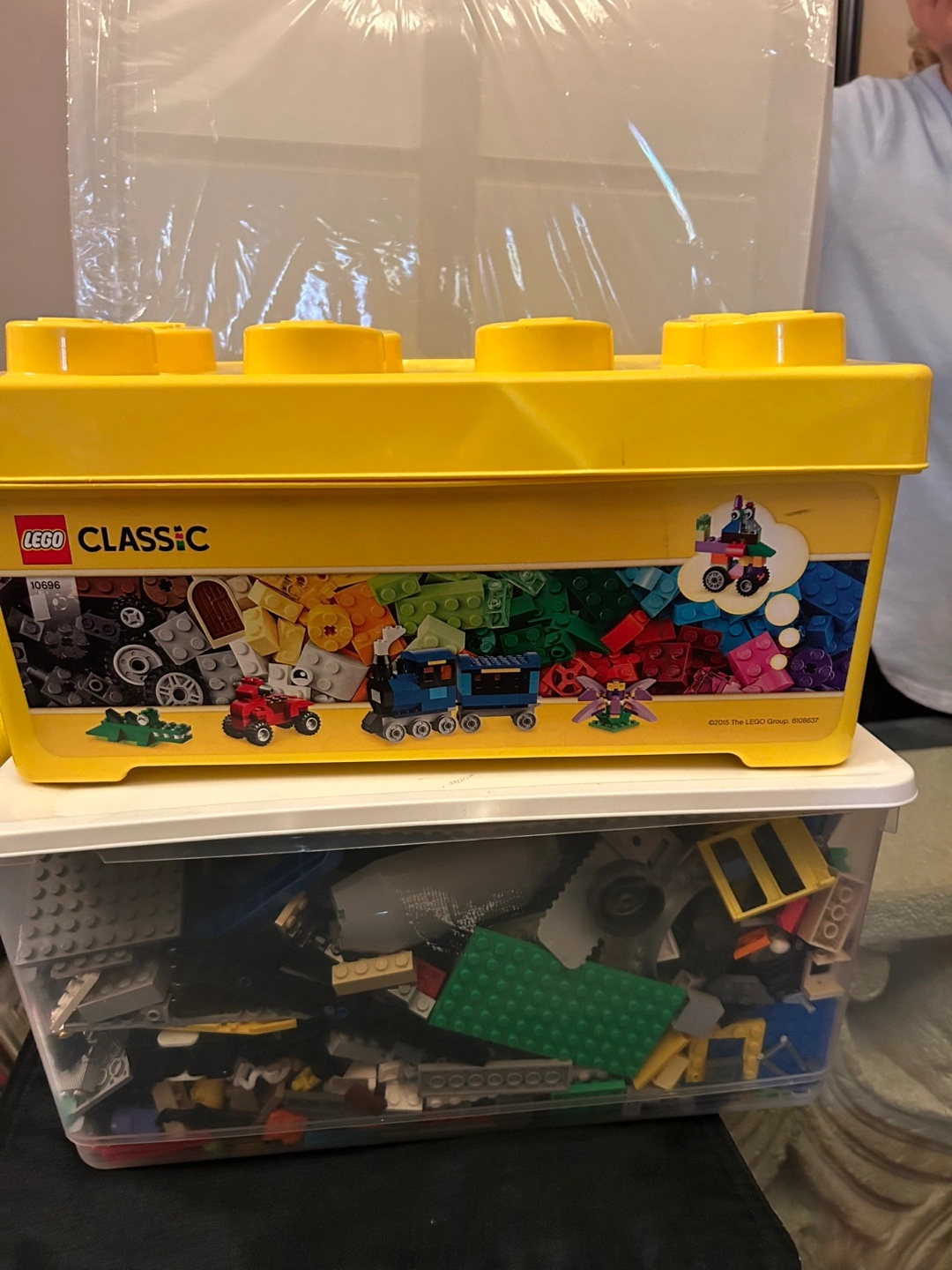 Large LEGO Classic Storage Box with various pieces and minifigures. Includes baseplates, wheels, bricks, and other parts.