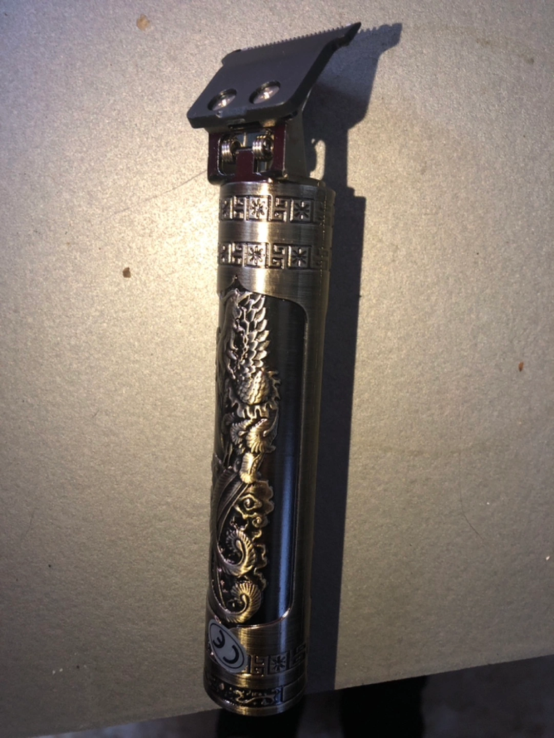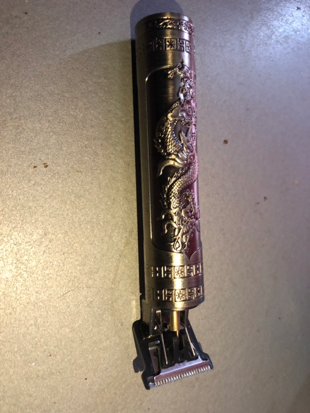 Electric hair trimmer with a dragon design, comes with a charging cable, cleaning brush, and 4 attachment combs. Used but in good condition.