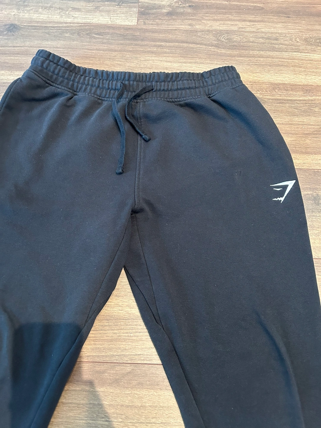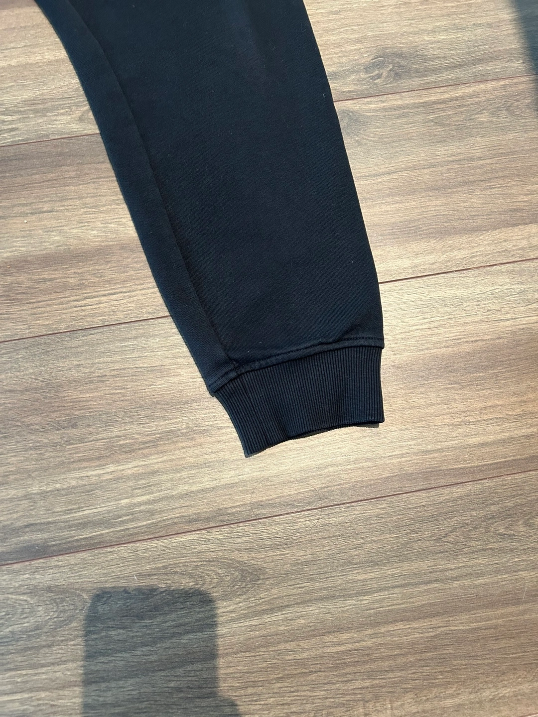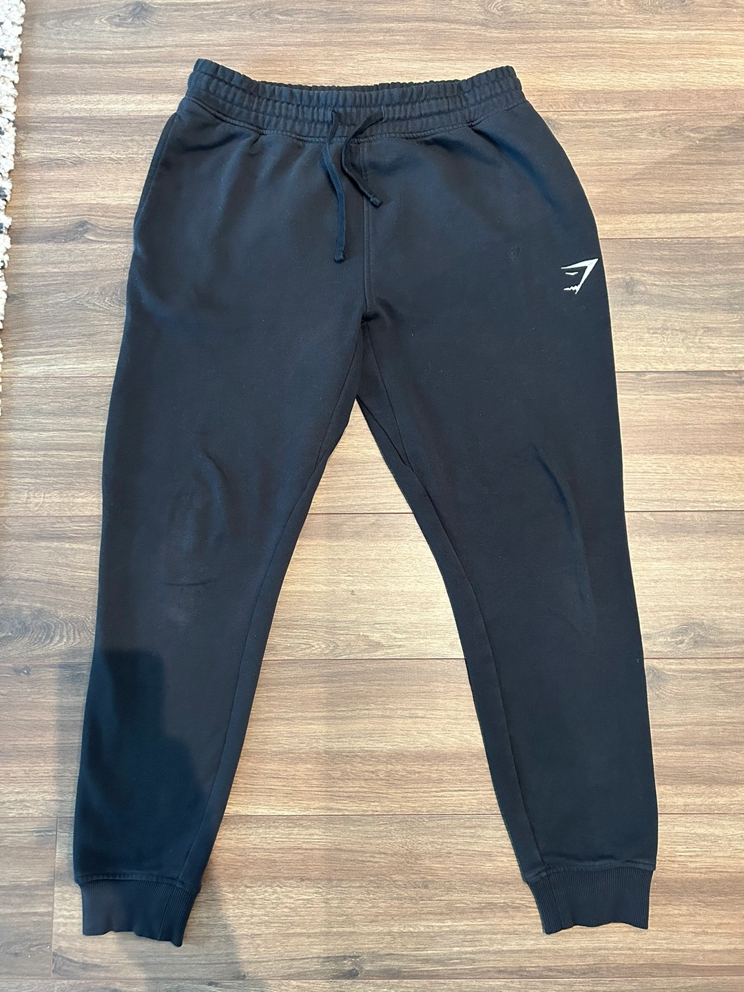 Black jogger pants, size medium. Ribbed ankle cuffs. Has a drawstring and two side pockets. Back pocket with snap closure.