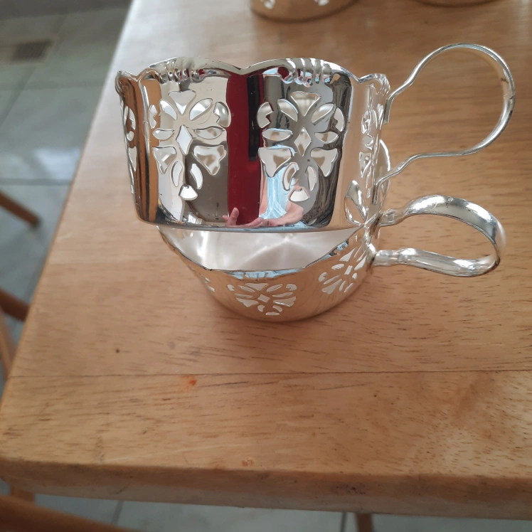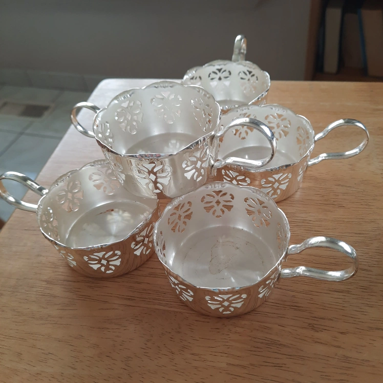 Set of six silver-plated serving cups. Each cup has a decorative cut-out design. Perfect for serving desserts or appetizers. Also used for tea.The glass cup inserts are not included.