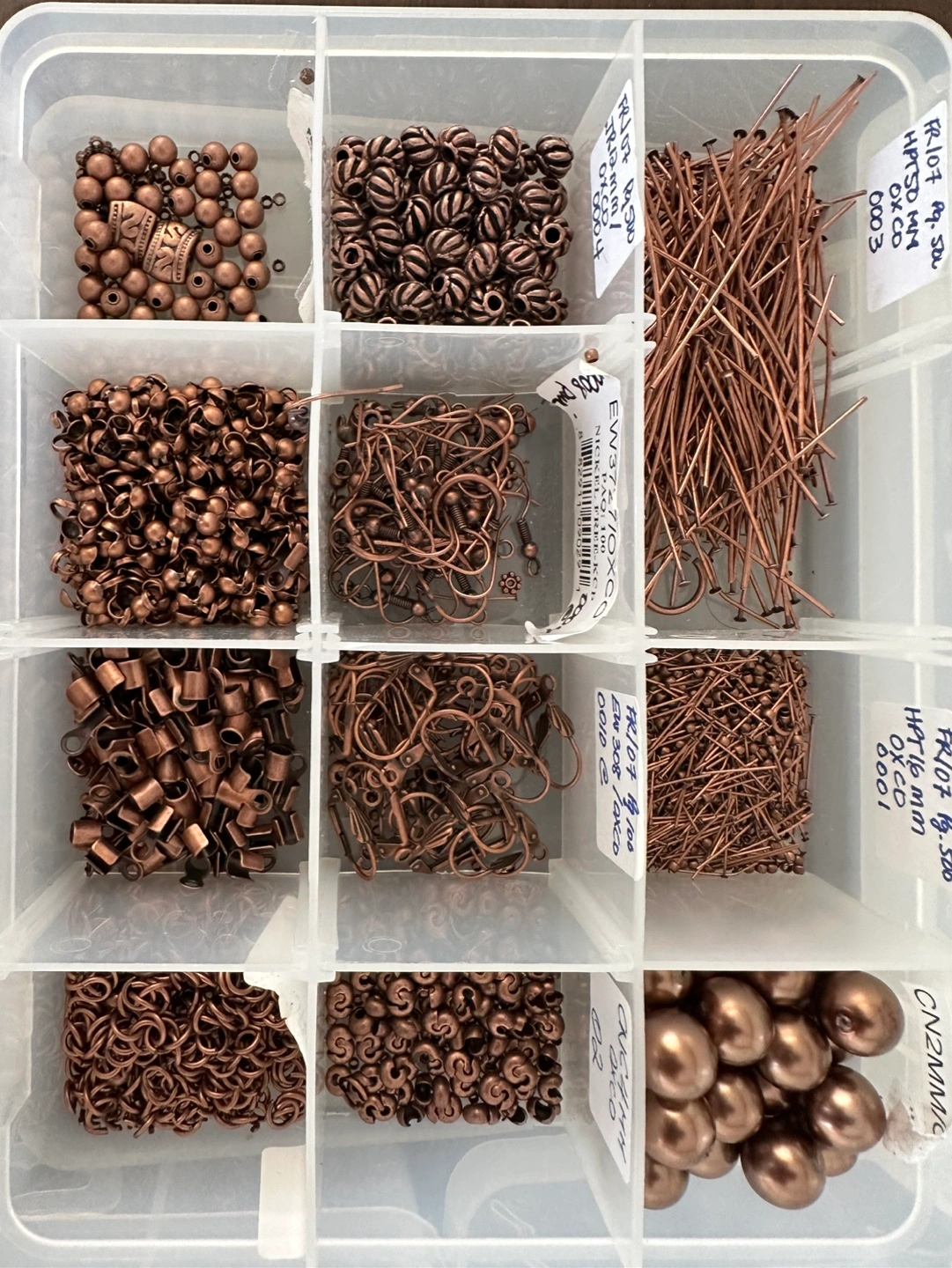 Variety of copper jewelry supplies in a clear plastic container. Includes: beads, earring hooks, jump rings, clasps, head pins, and round beads.