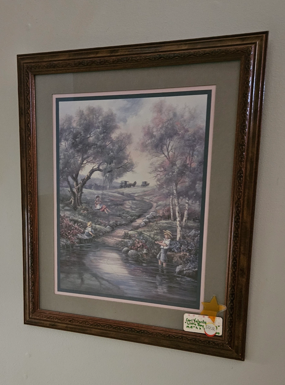 This beautiful vintage print by artist Carl Valente captures an idyllic Amish setting. Measuring 19x16 inches, it comes in a glassed wooden frame and is matted for a classic look. The print inside the mat is 10 x 13 inches and is in great shape, with no noticeable wear and tear.