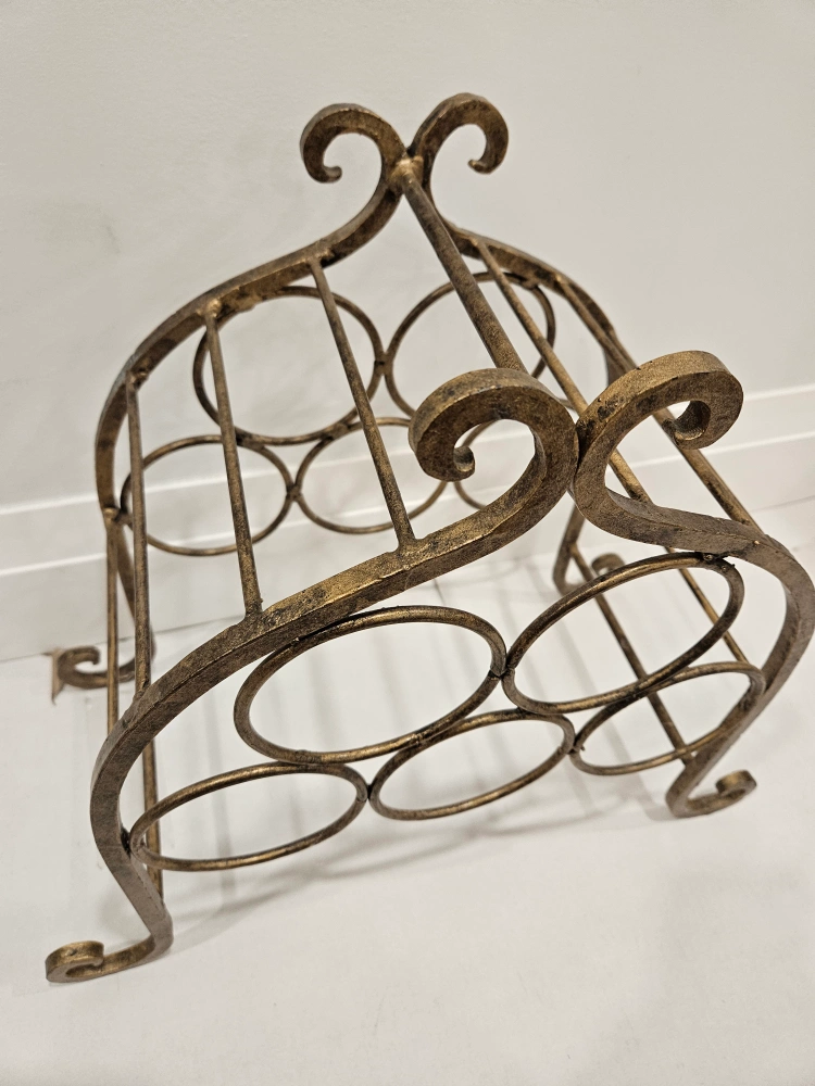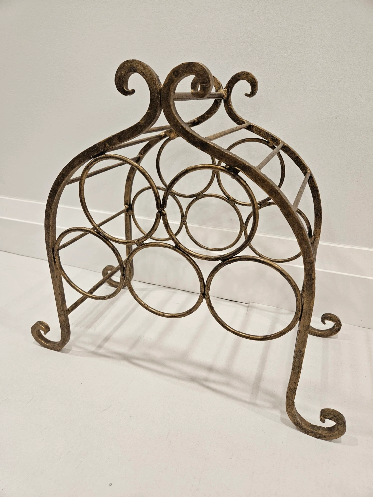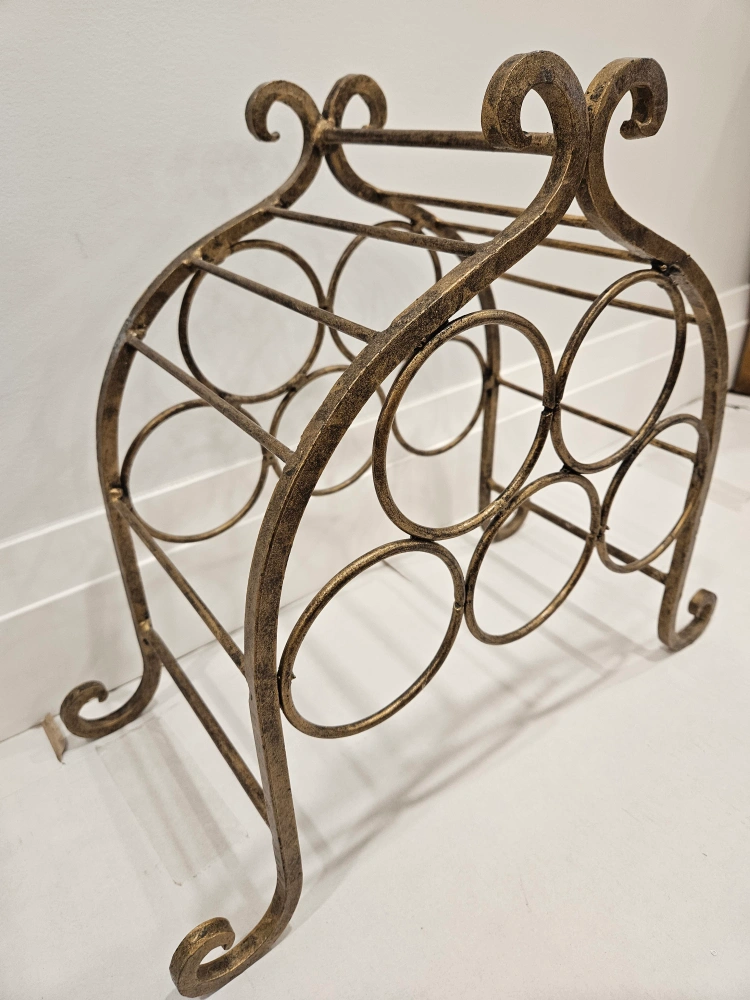 97Metal wine rack with six bottle spaces and a decorative top. The metal has a gold finish. Metal wine rack Gold colour 18 inch wide 16 inch tall 8 inch deep Check my other ad more decor