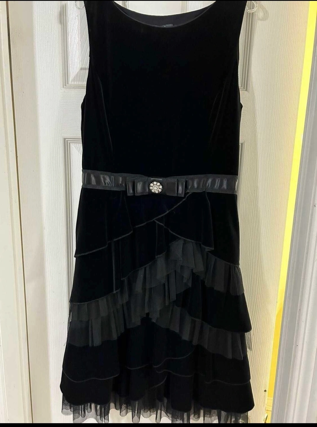 Sleeveless black velvet dress with a black ribbon and jewel embellishment at the waist. Features a layered tulle skirt with ruffles. Small make - probably fits smaller