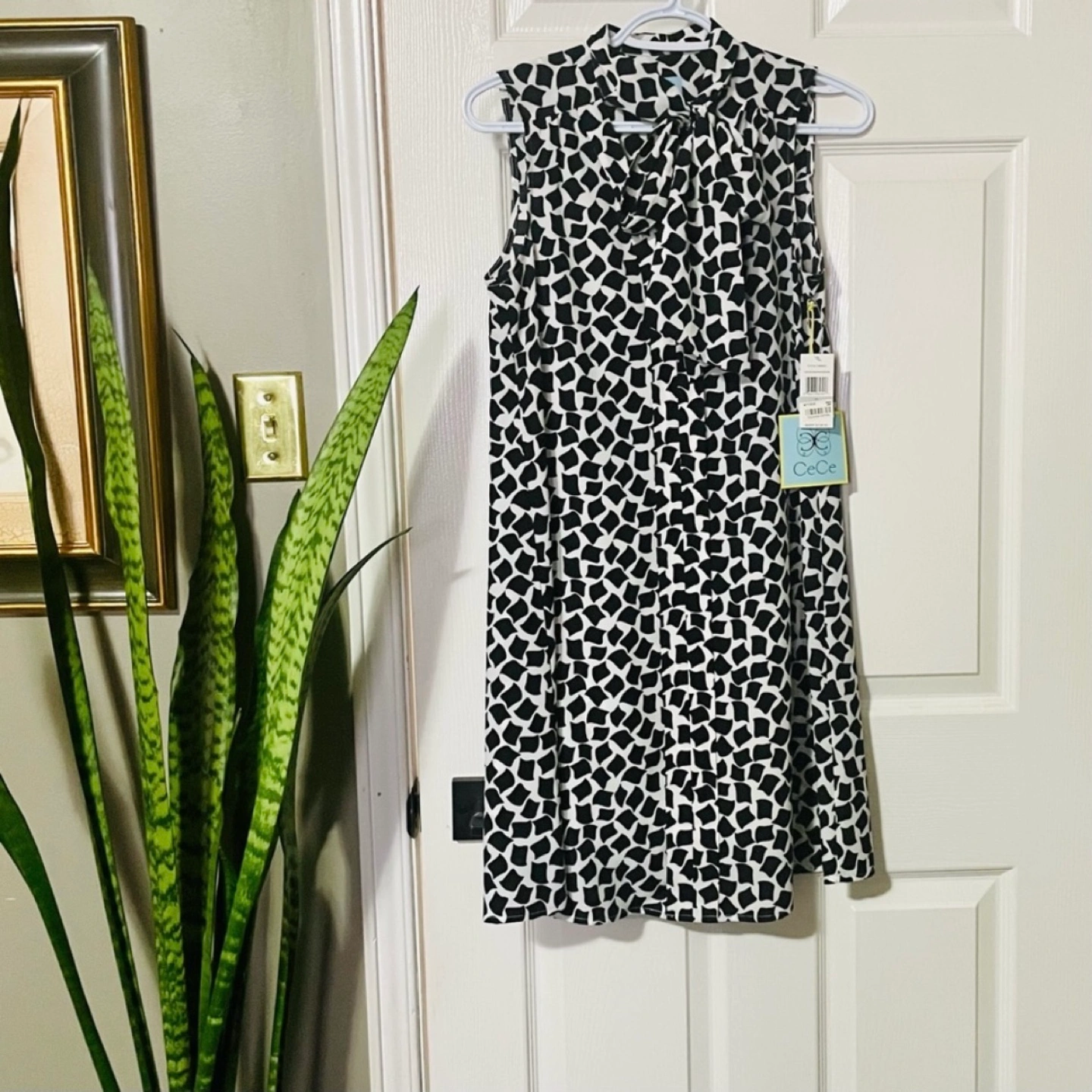 CeCe A-Line Shift Dress White w/Black Patterns with Tie Neck Brand New with Tags