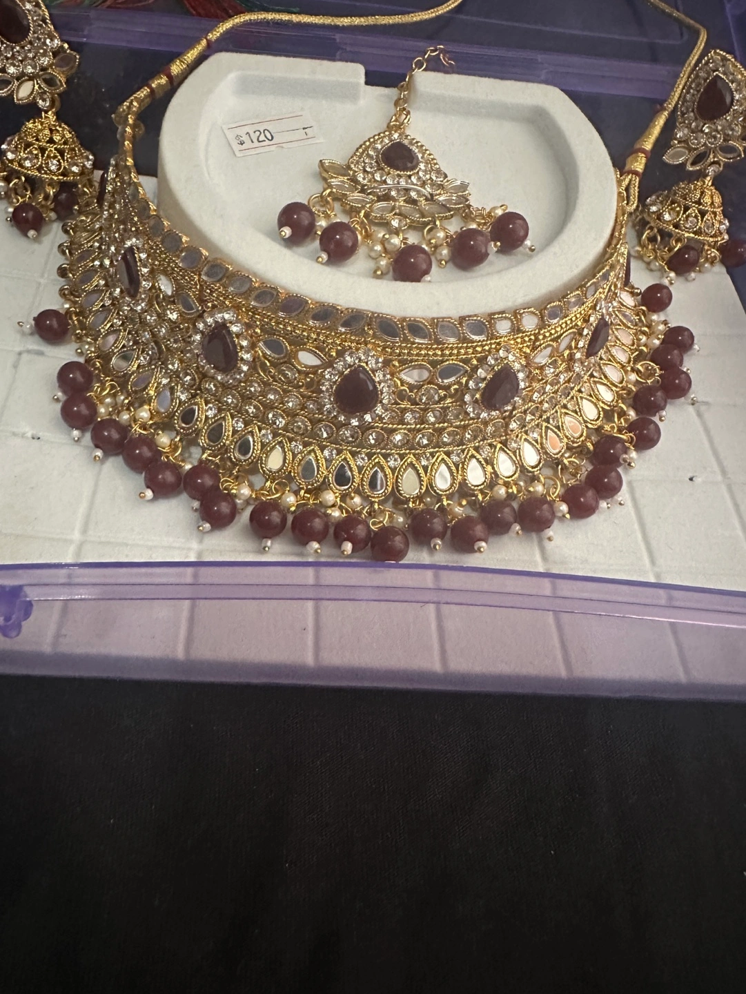 Gold-toned jewelry set with a necklace, earrings, and a maang tikka. Features pearl accents and pink and maroon stones.