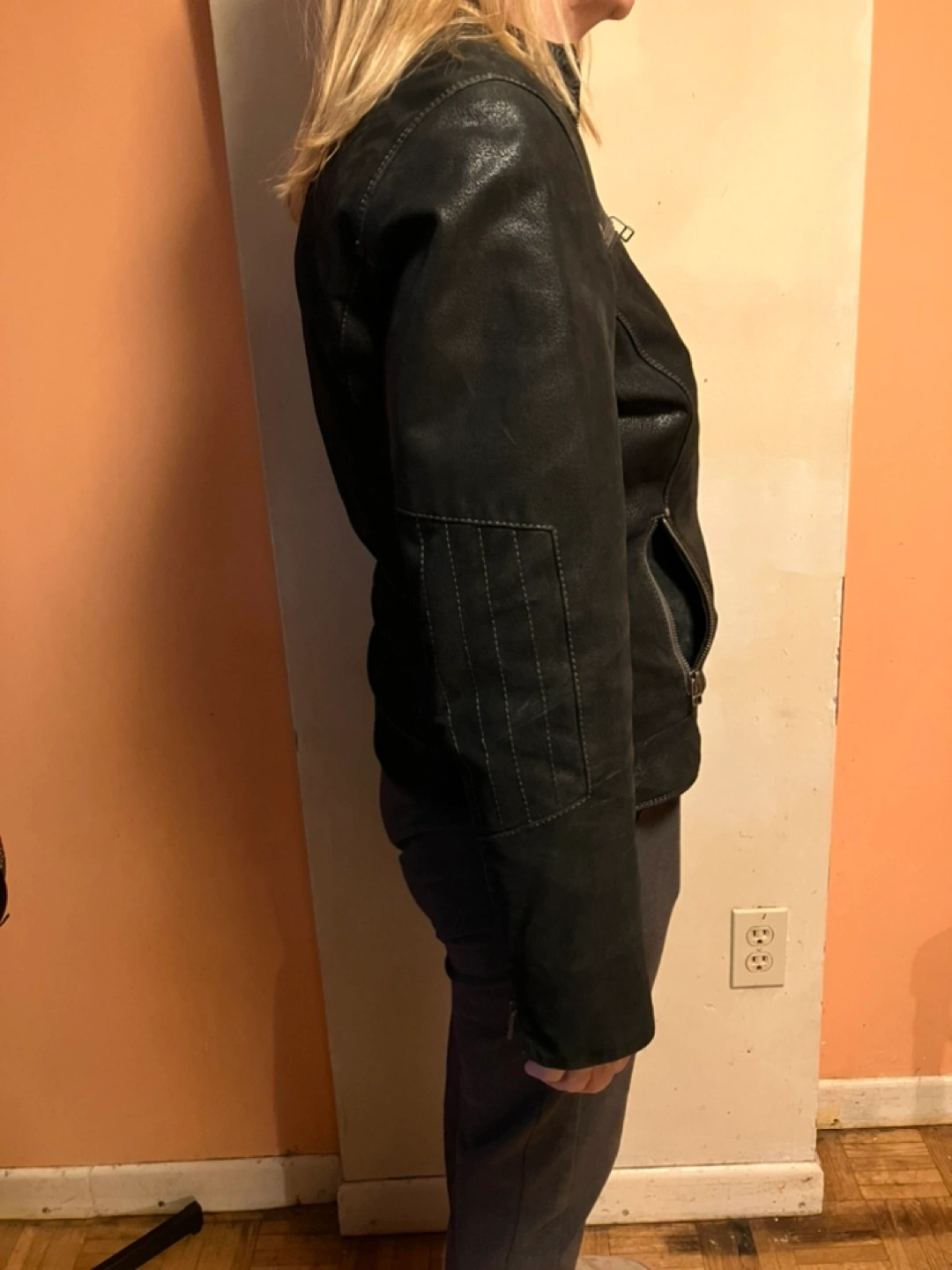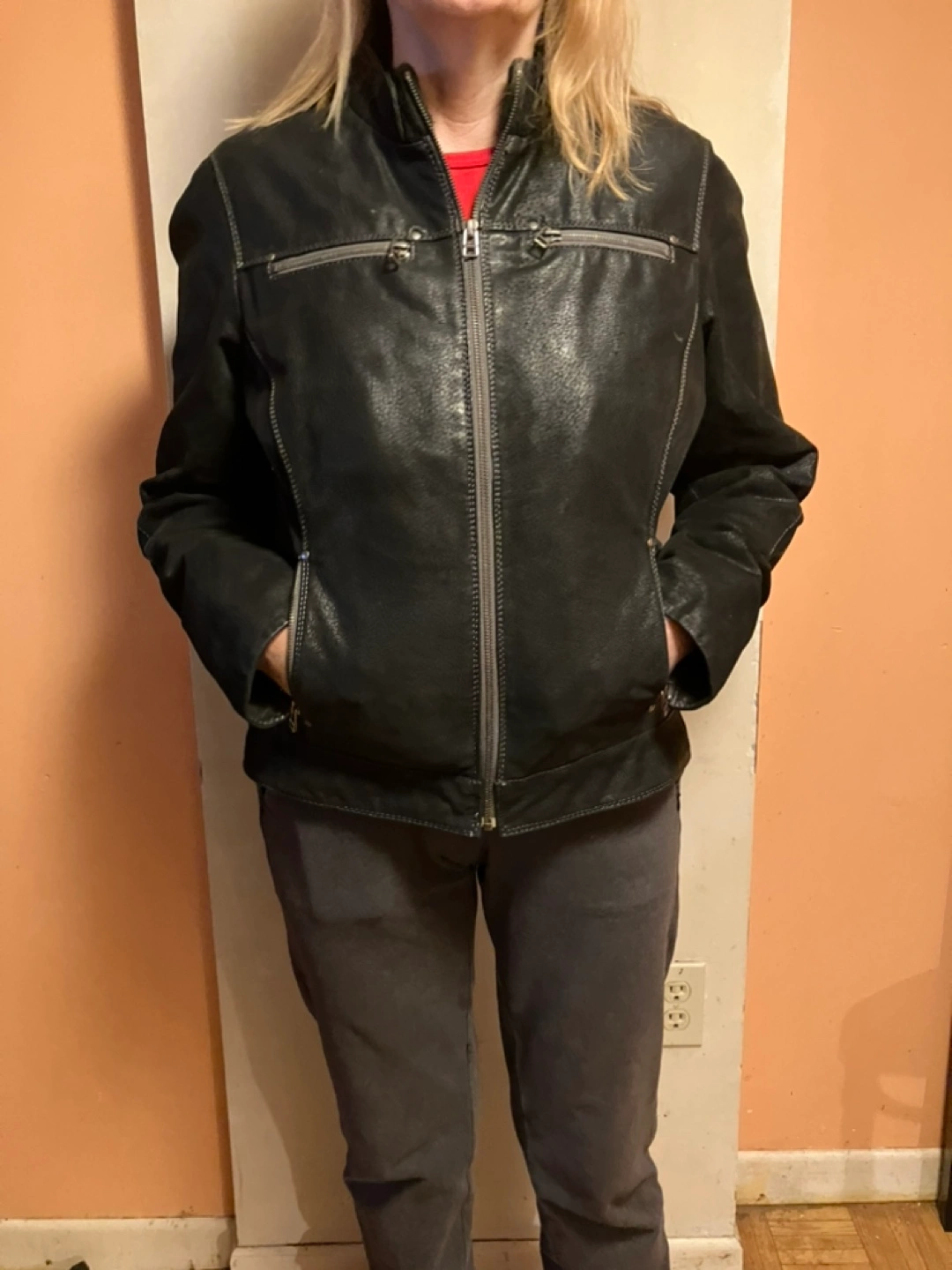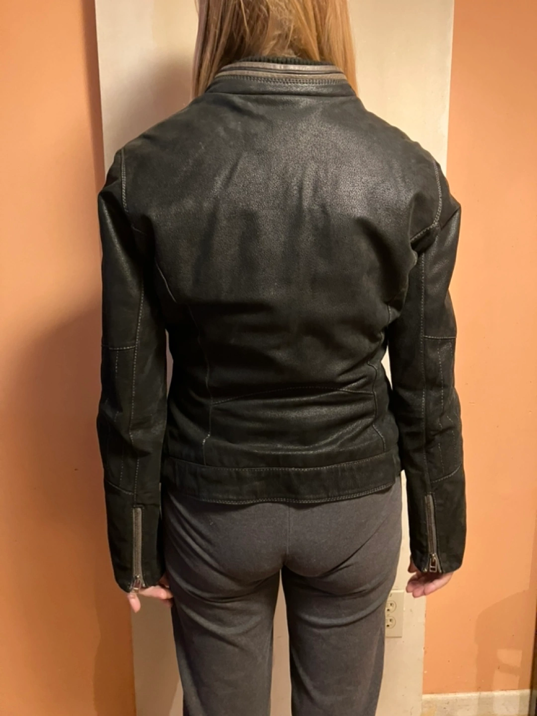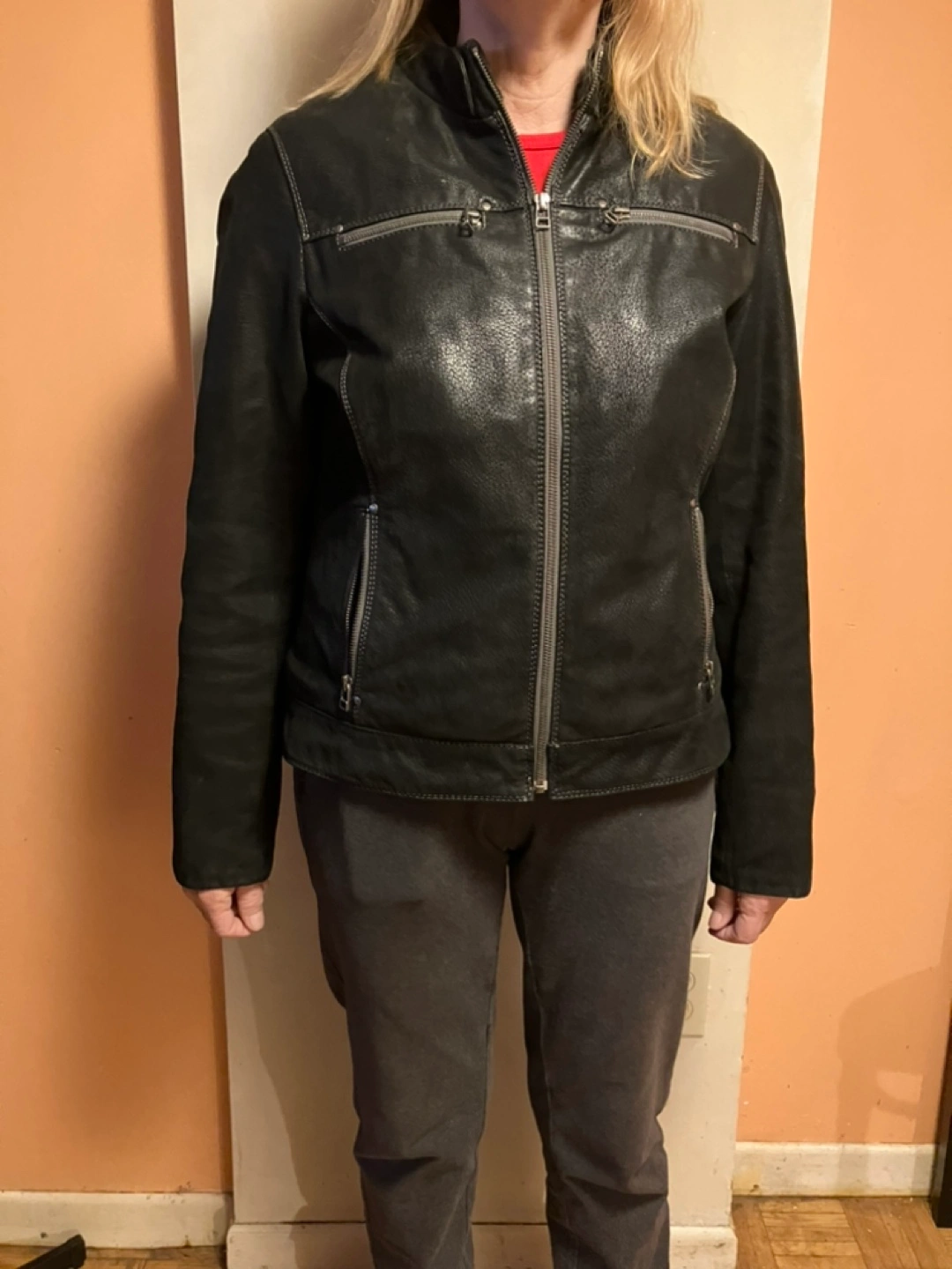 5Black leather jacket. Size Medium. Zipper closure. Two front pockets. Zipper detail on sleeves.
