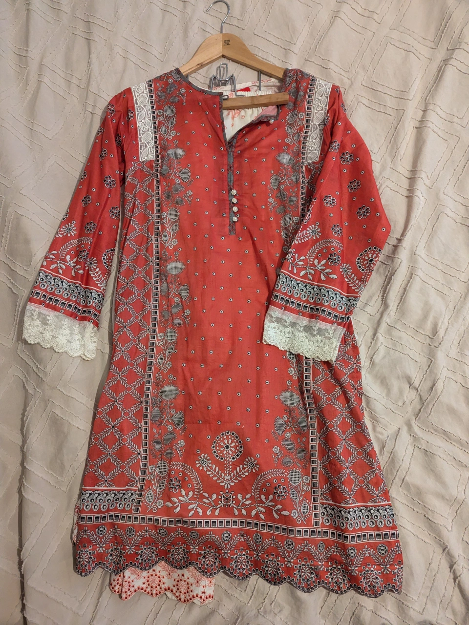 Zeen Pk. bought from Pakistan. Red floral kurta with lace detailing on sleeves and neckline.