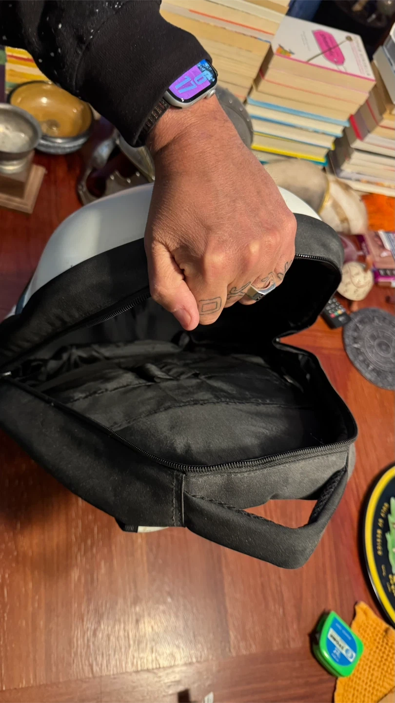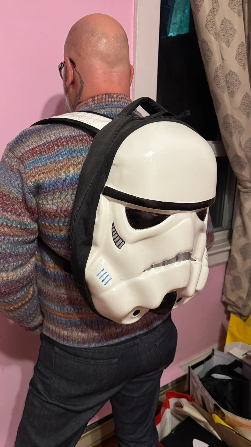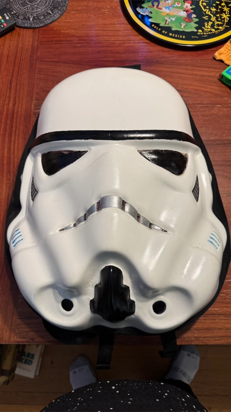 This is a Star Wars Stormtrooper helmet backpack. It's white with black accents and has adjustable straps. The main compartment is accessible via a zipper.