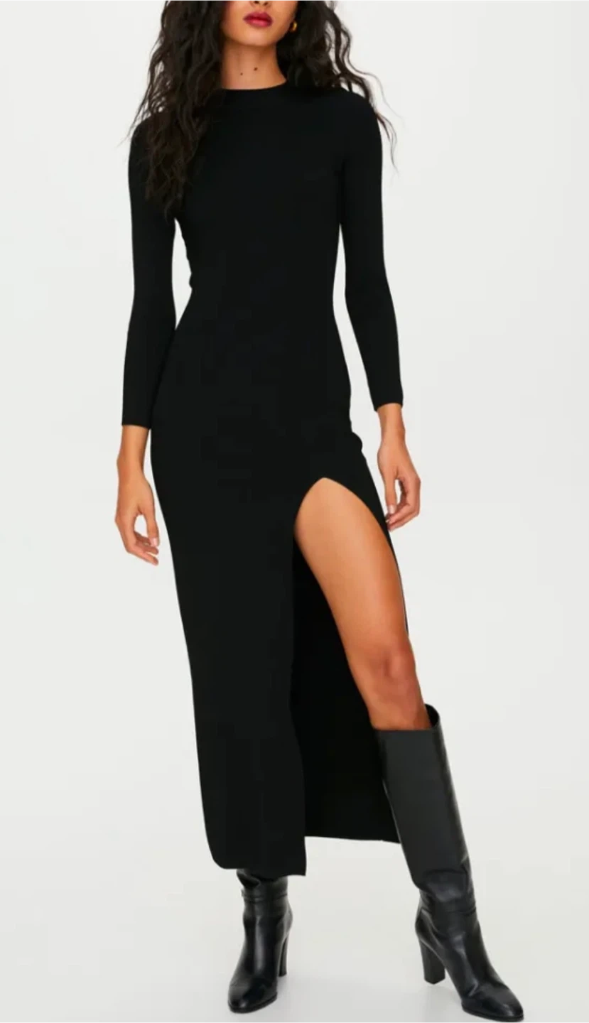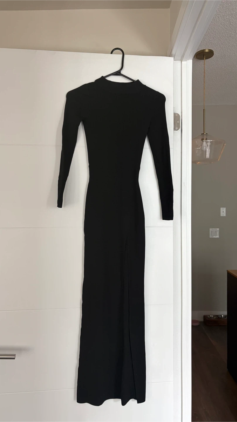 This Babaton black dress features long sleeves and a daring high slit. Worn once, in perfect condition