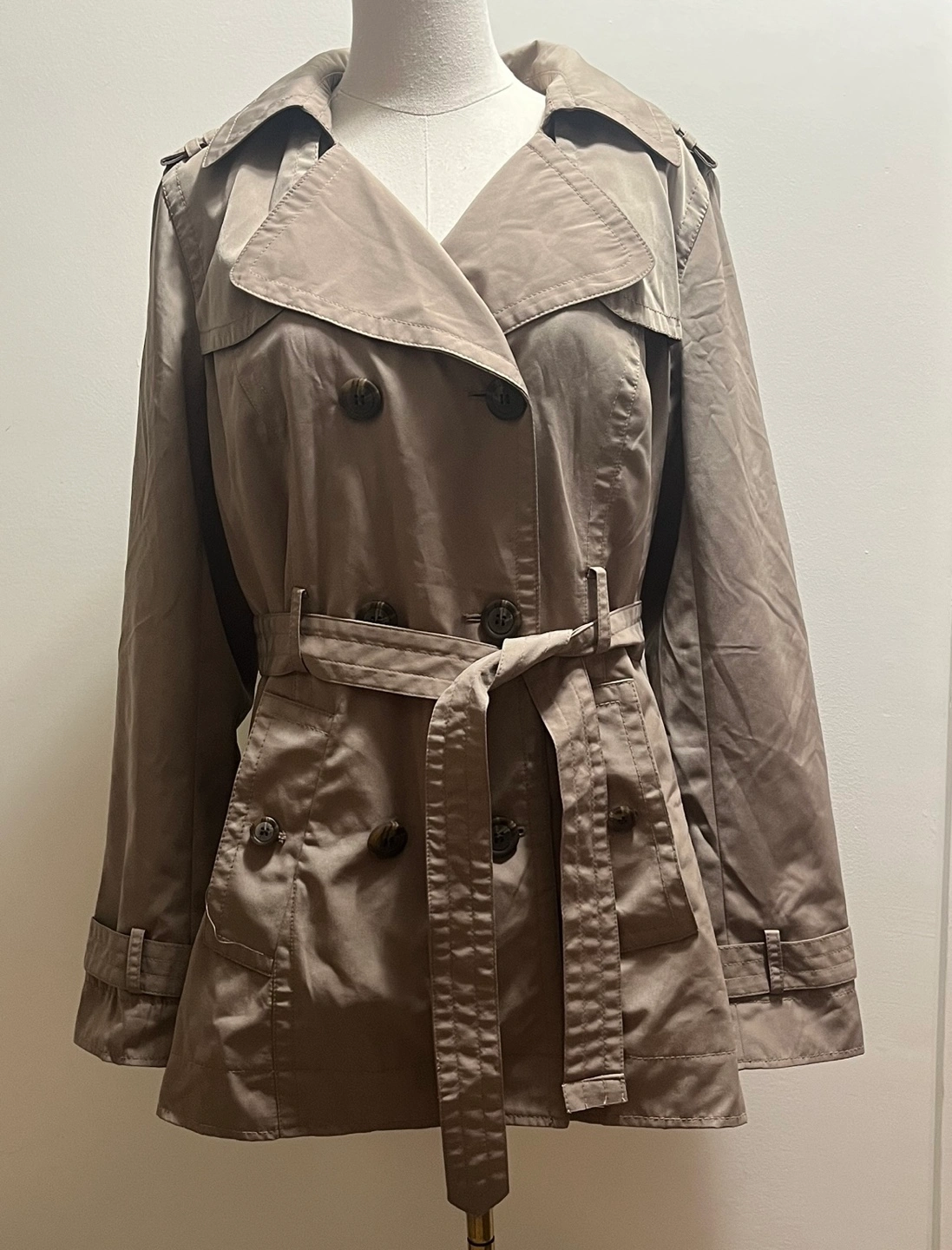 Womens light brown trench coat with a belt. Double breasted with buttons. Has two pockets on the front.
