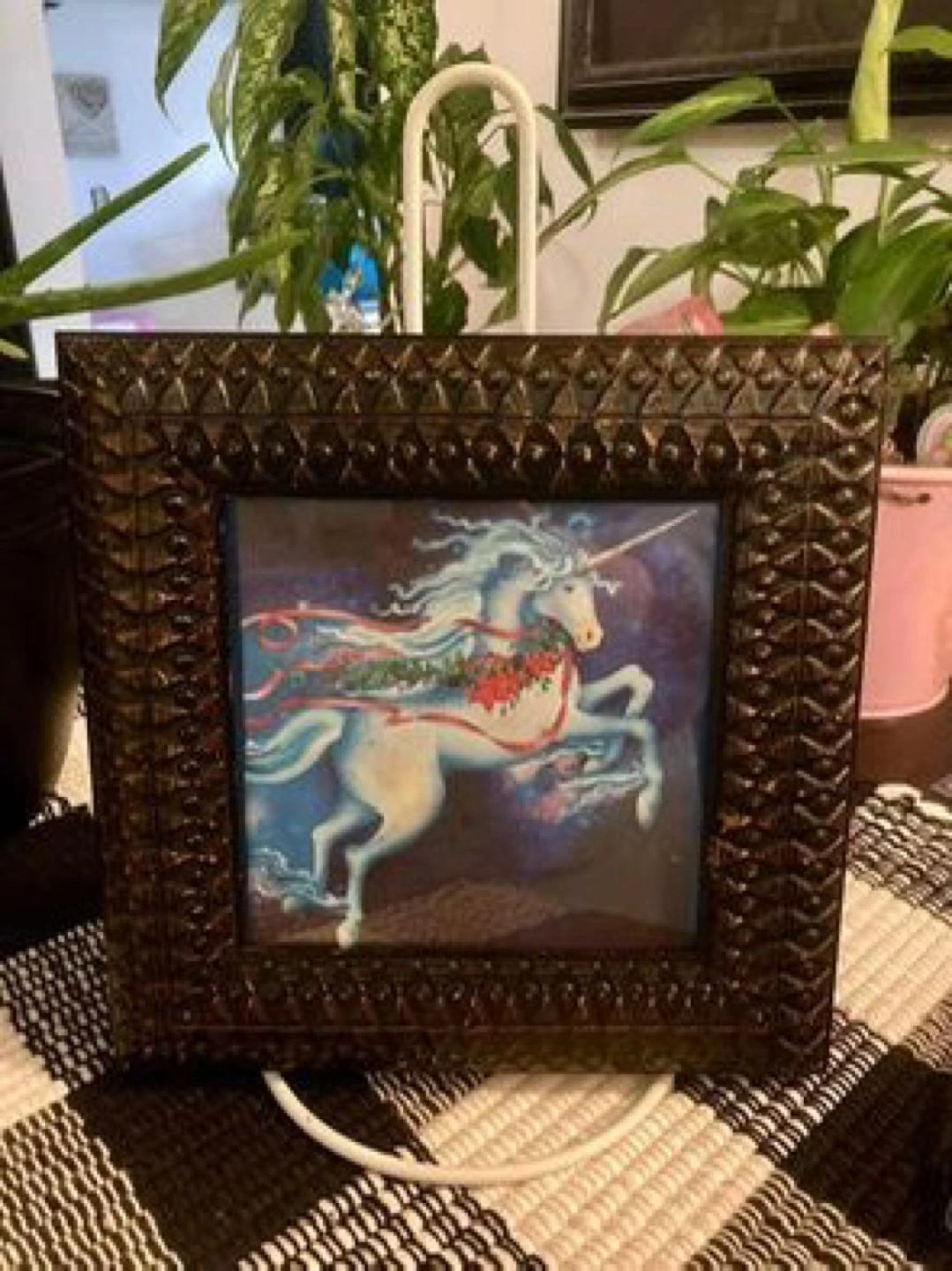 Brand new Christmas unicorn picture , with wooden frame & glass covering . Size is in the pic . From a smoke free home . Pick up in Woodstock . $10 firm . Cash only