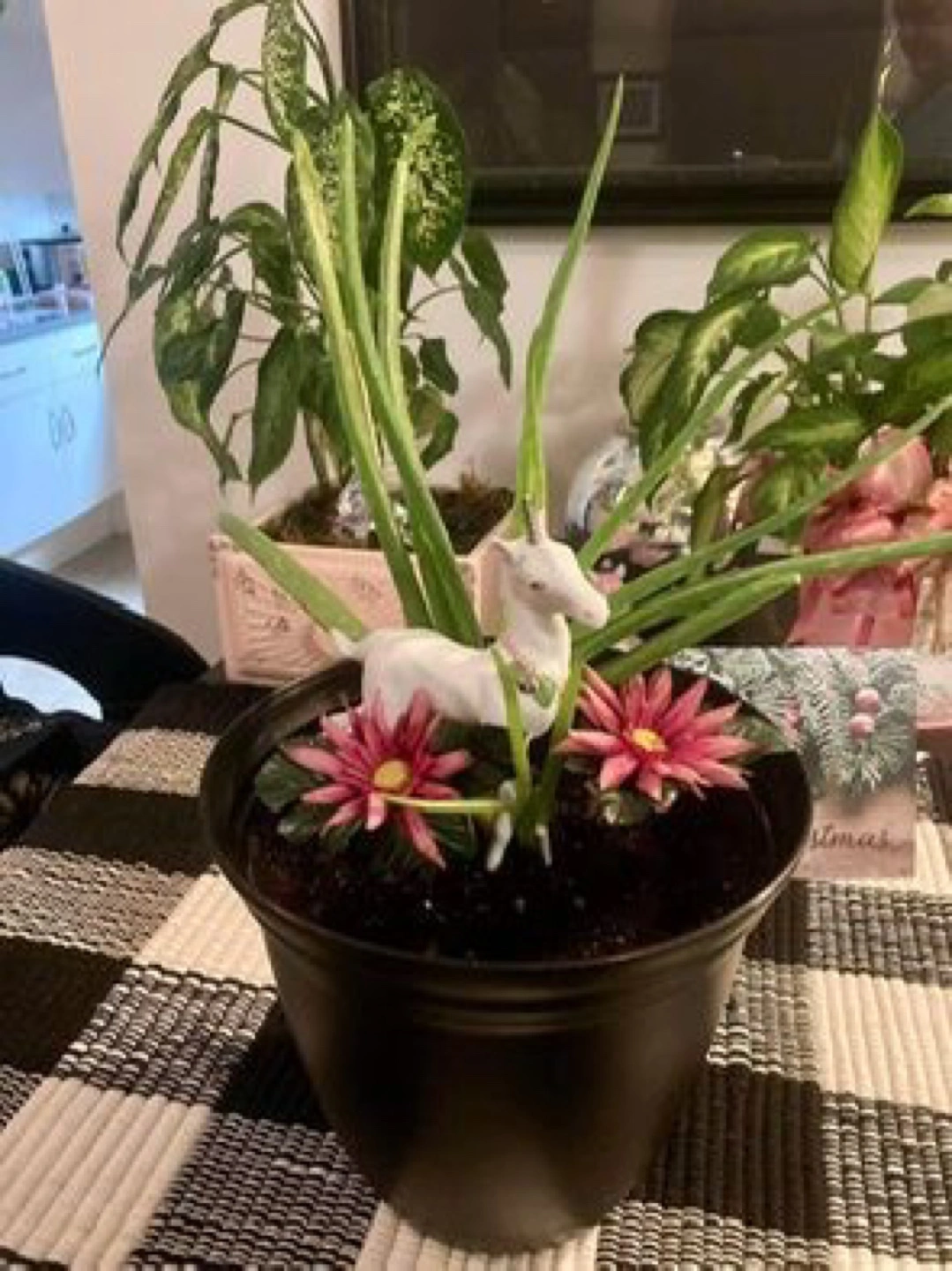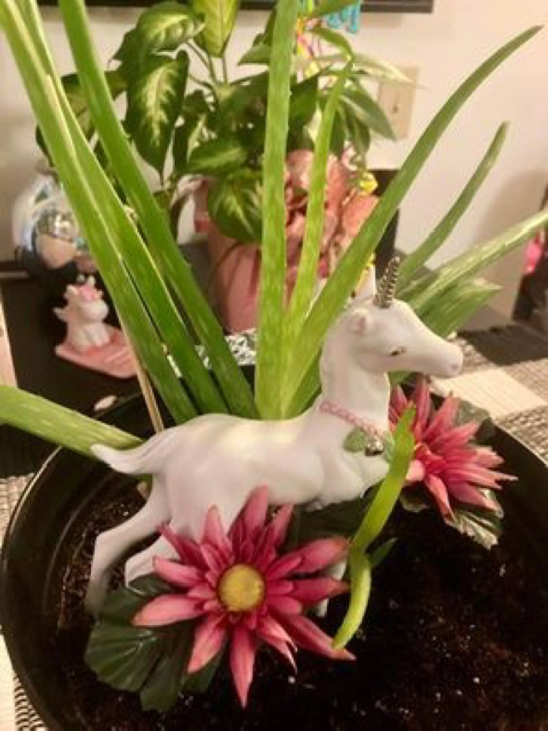 Aloe Vera plant with unicorn figurine and two pink flowers. Pot included.