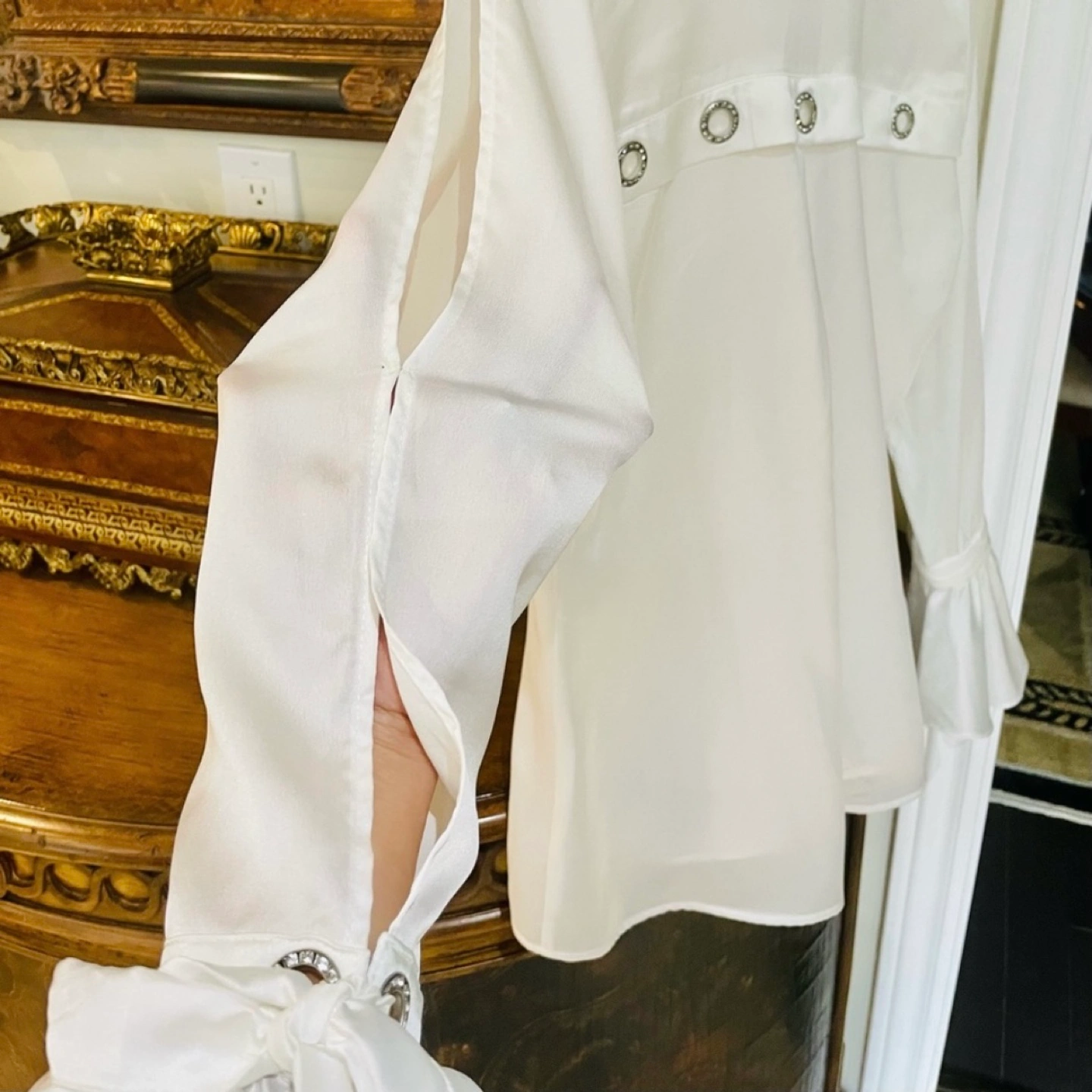 This beautiful cold shoulder blouse features rhinestones on both sleeves and at the back. Elegant and so comfortable.
