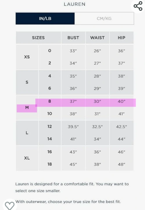 Size 8 - Please see photo with the size chart from Ralph Lauren for size measurements.