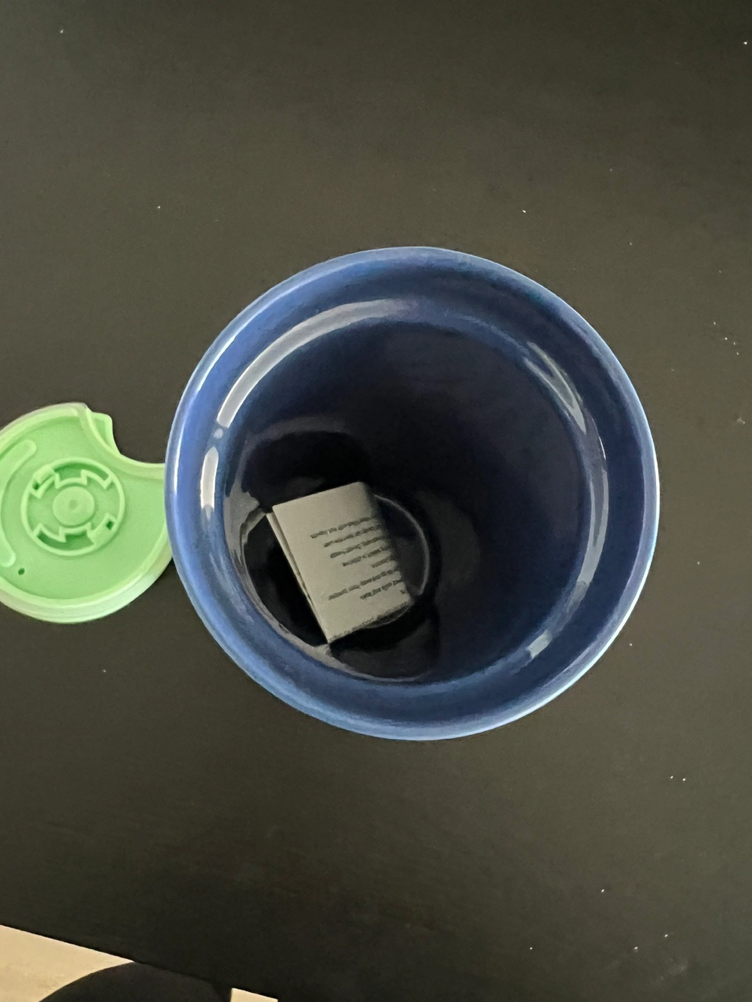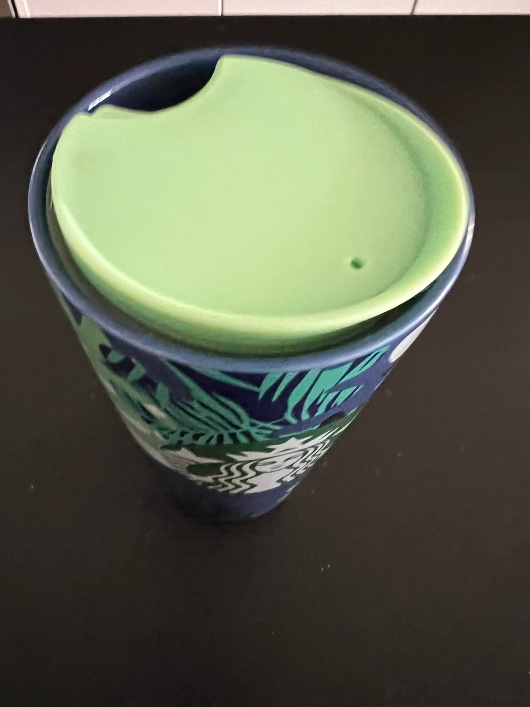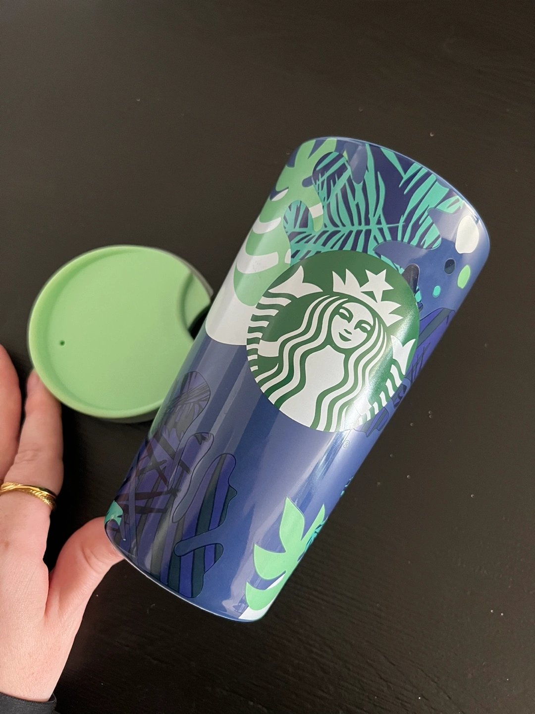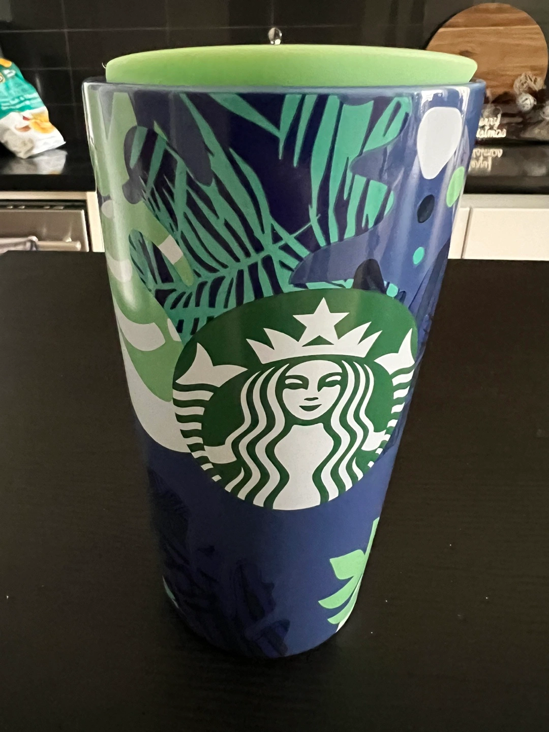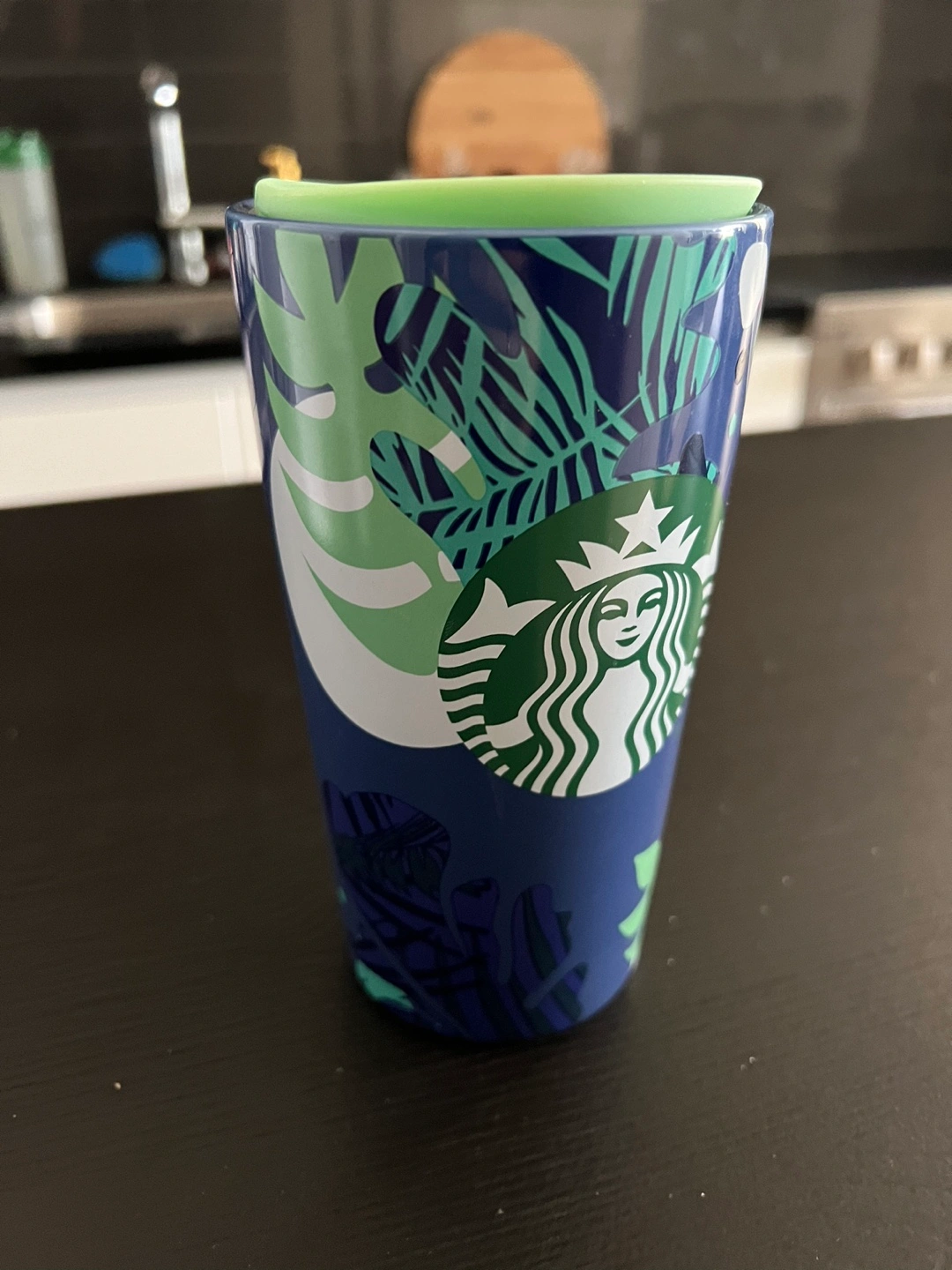92Blue reusable cup with a green lid. Features a tropical leaf design and a Starbucks logo. Never used and not plastic