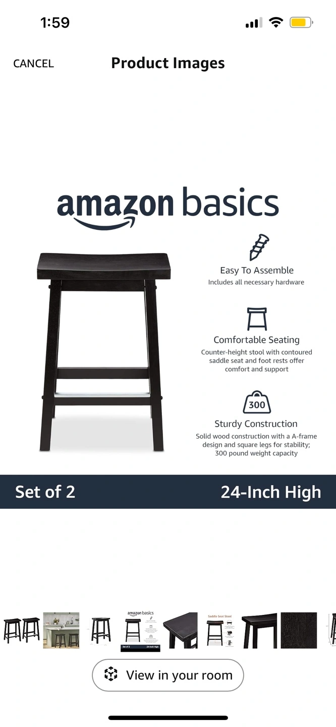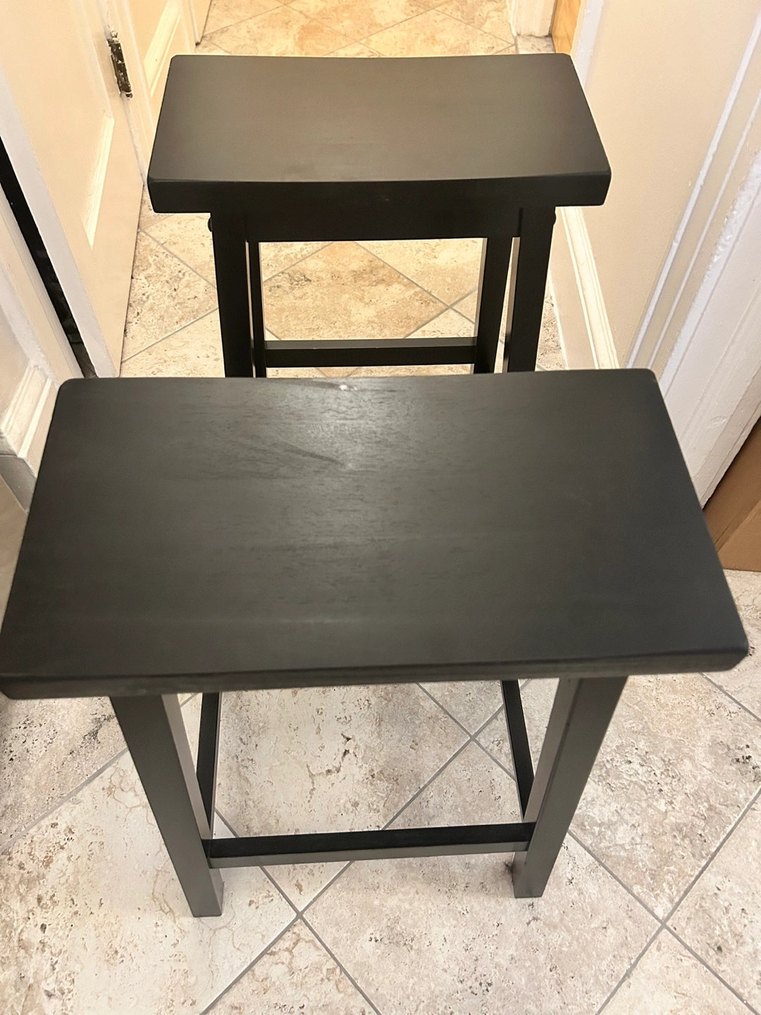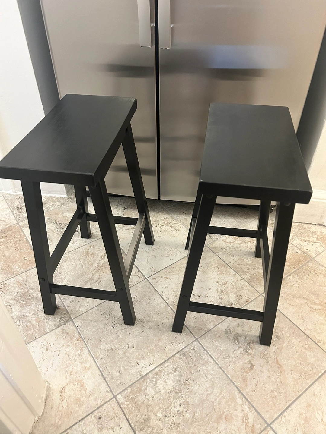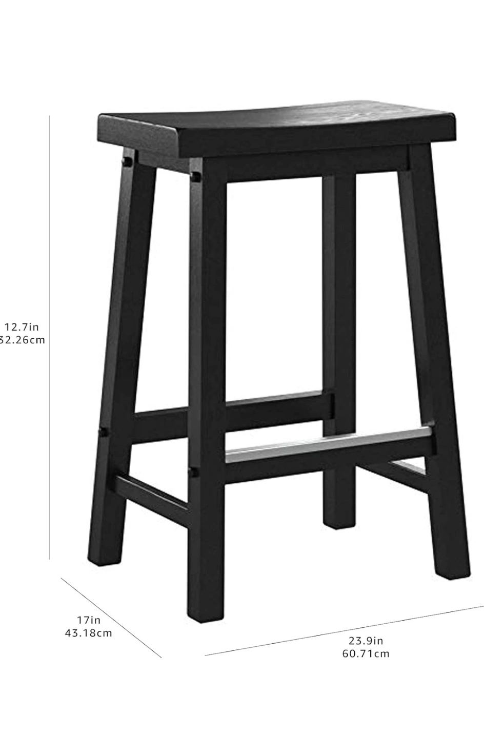 Amazon Basics solid wood saddle seat kitchen counter height stools - 24 inch height, black. Each have a metal foot rest.