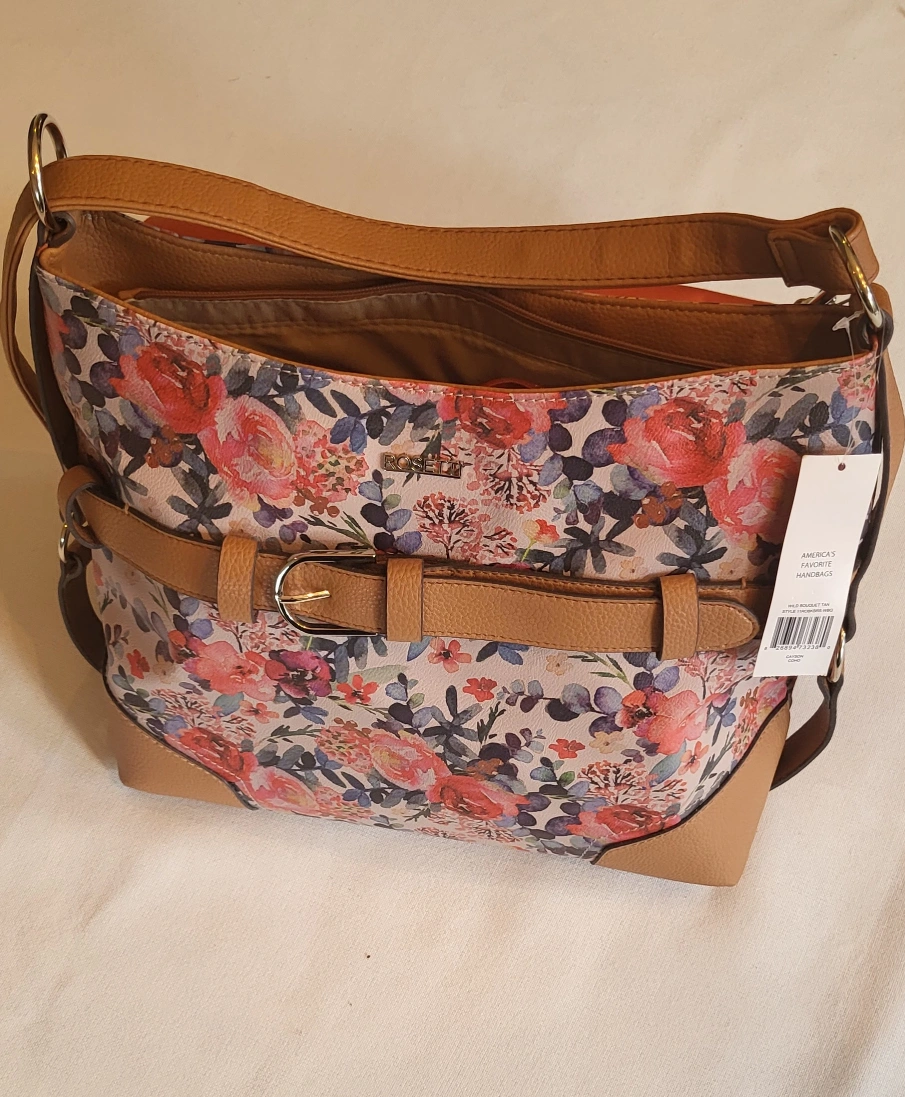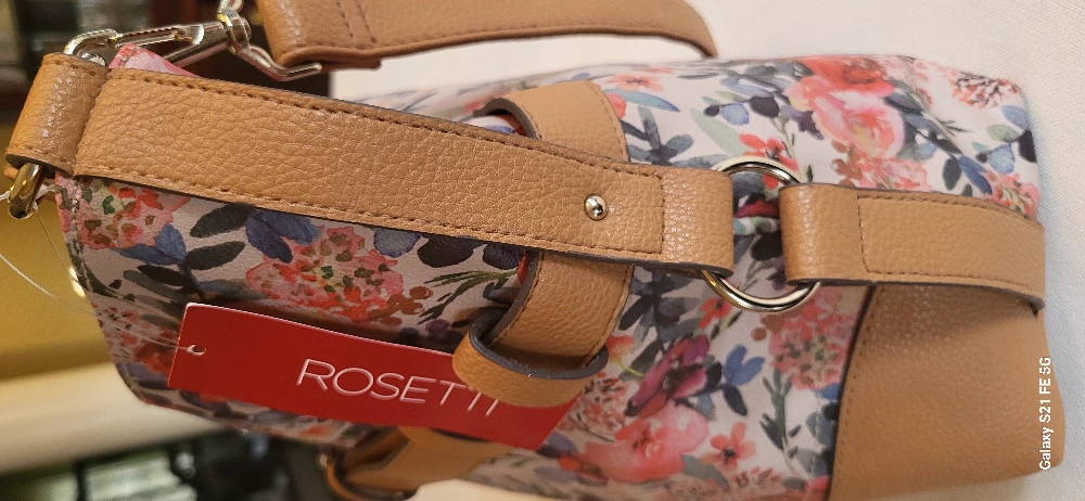 Brand new,Floral print handbag with brown trim, a belt detail and an adjustable shoulder strap. Zipper closure.