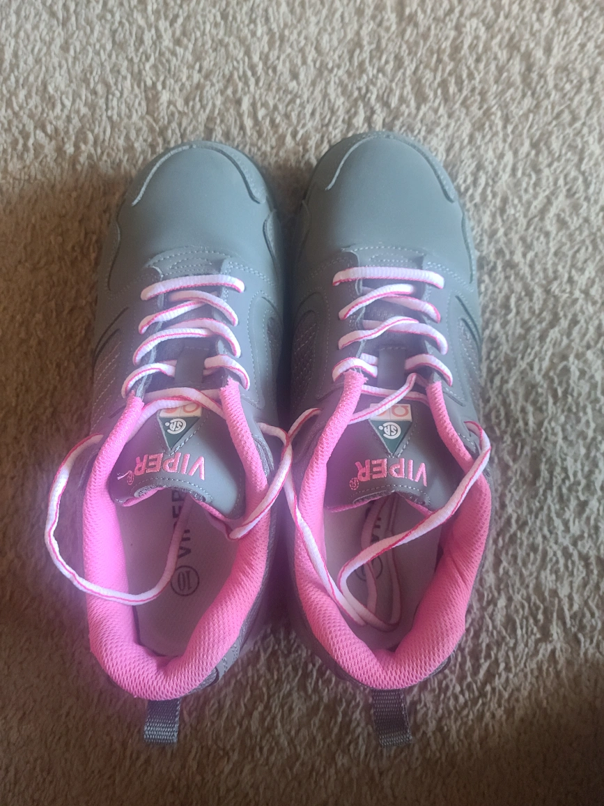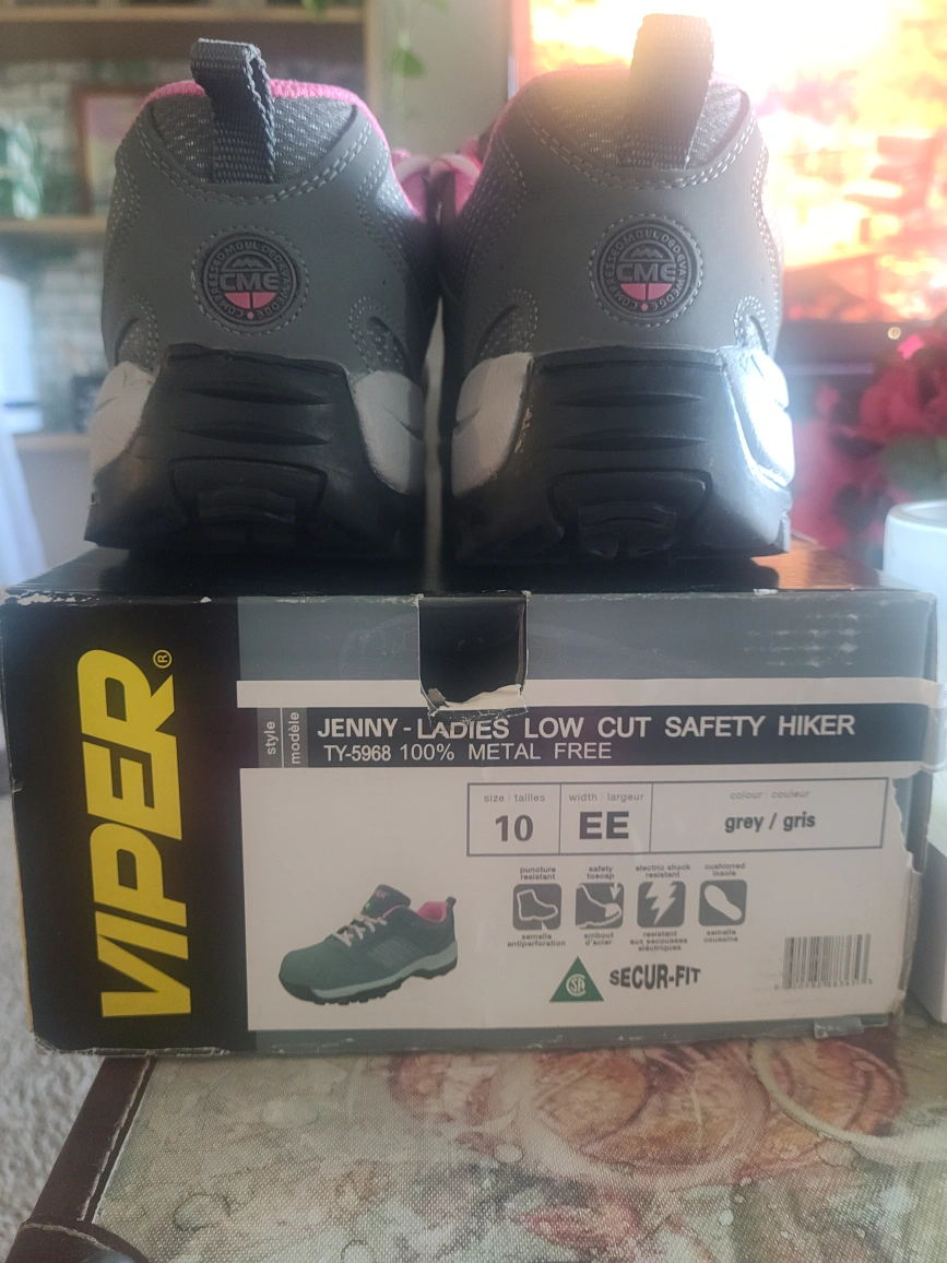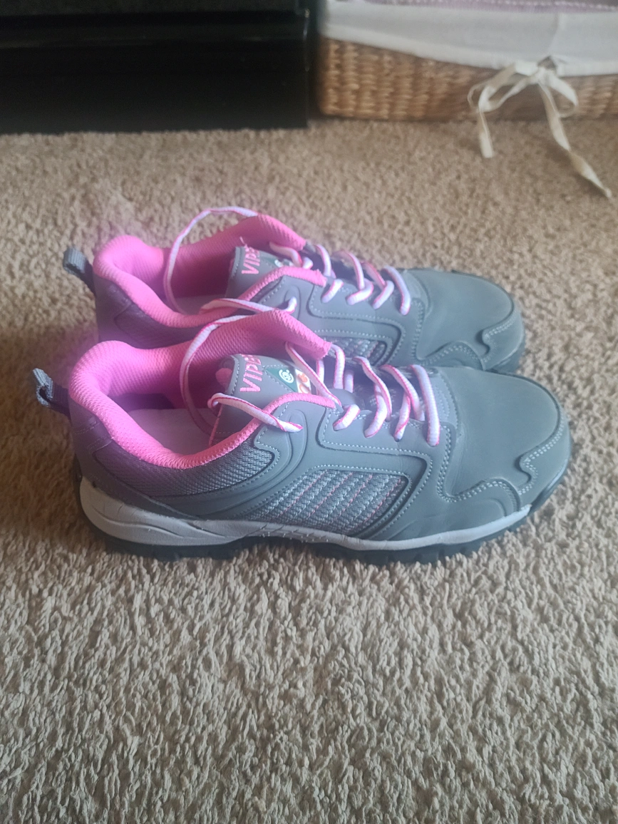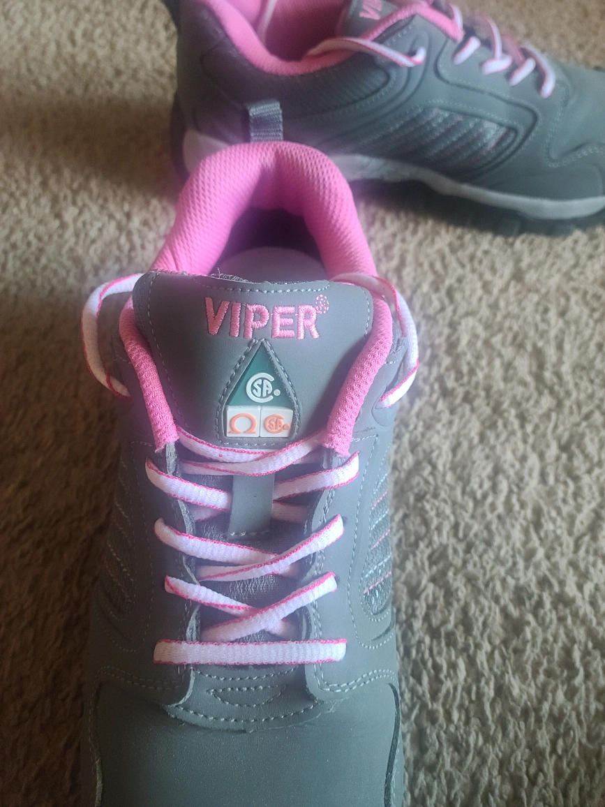 Gray and pink low cut safety shoes. Metal free, slip resistant, puncture resistant, oil resistant. Soft, nice and comfy.