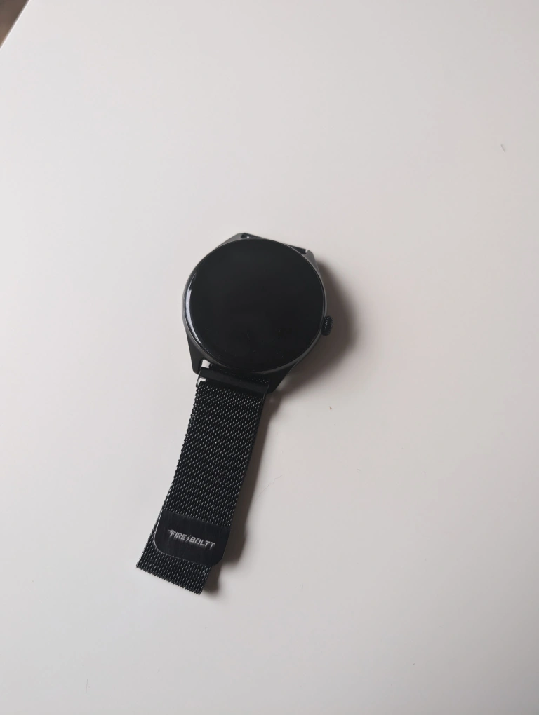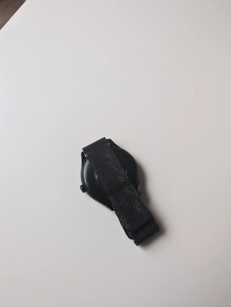 Black smartwatch with a magnetic belt and charger, need charging every 9-10 days.