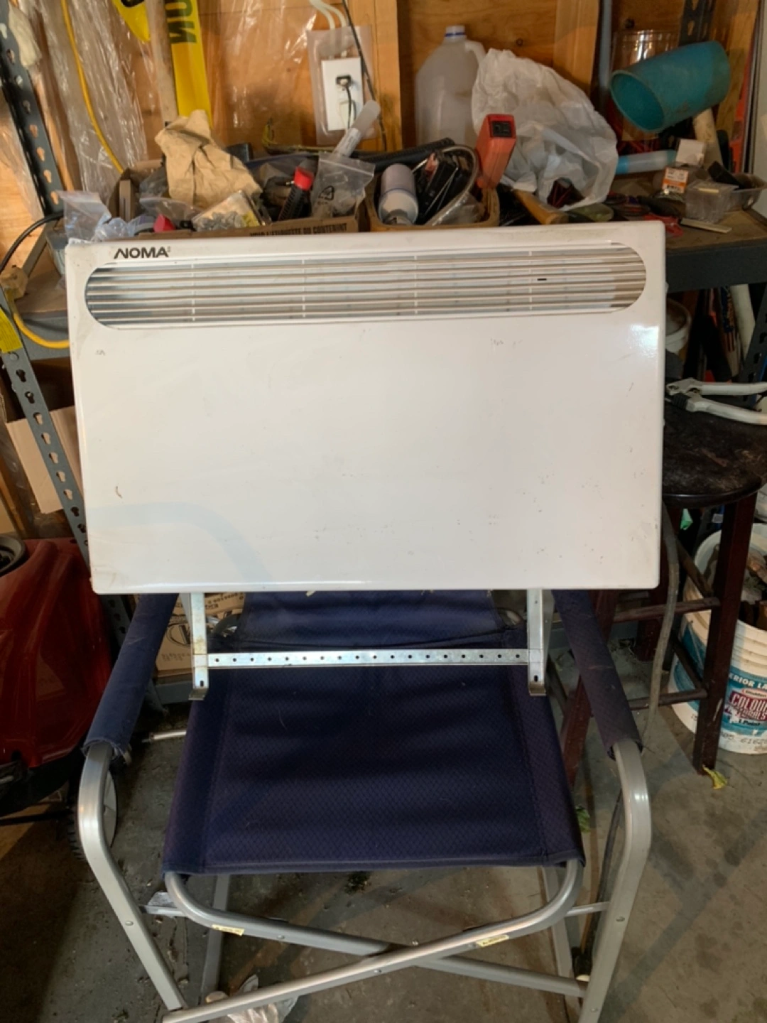 10White electric heater with a metal grate. Has adjustable thermostat and stand.220 volt