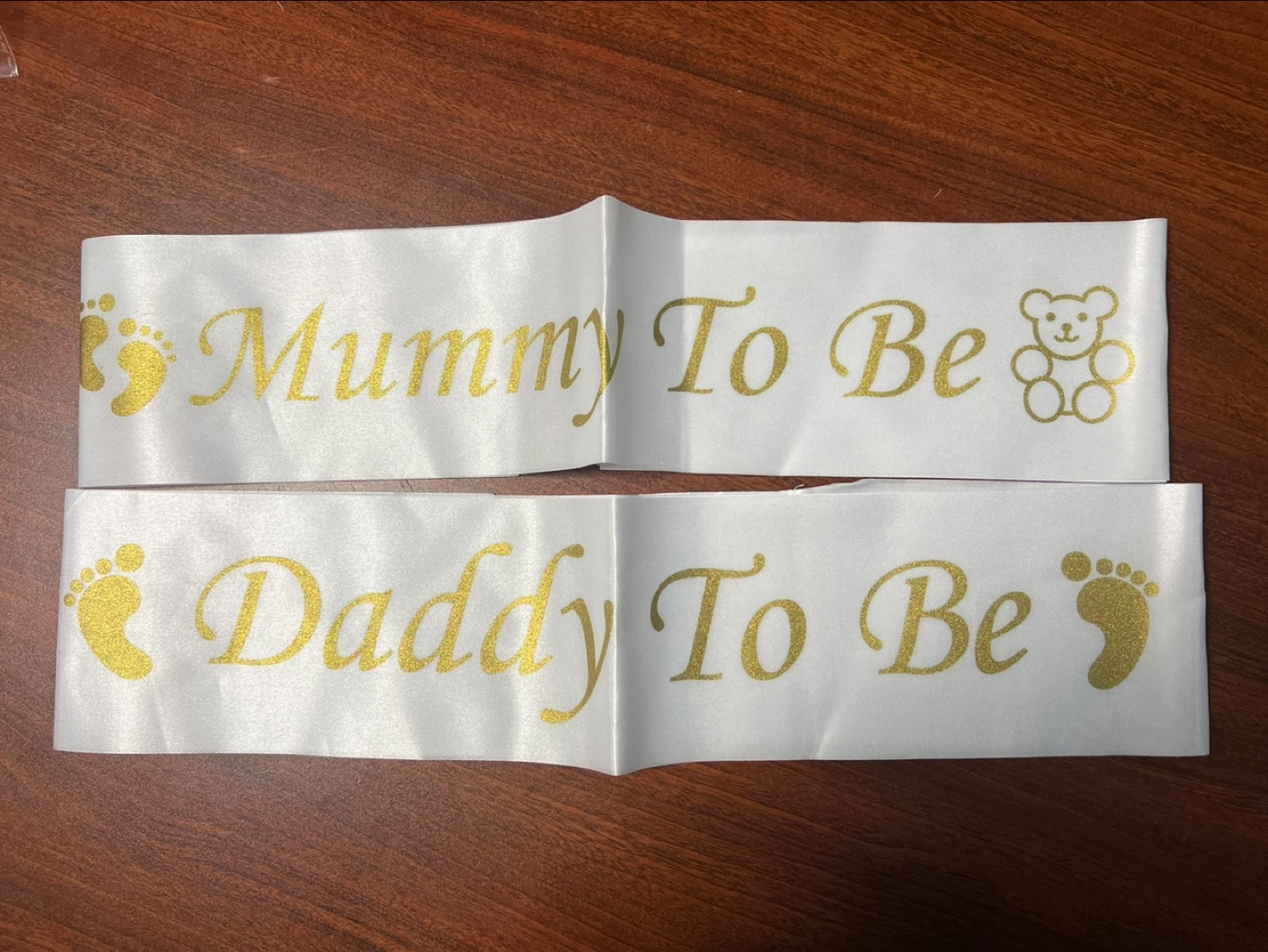 Two sashes, one saying Mummy To Be and the other saying Daddy To Be. Both sashes have a gold design of footprints and a teddy bear.