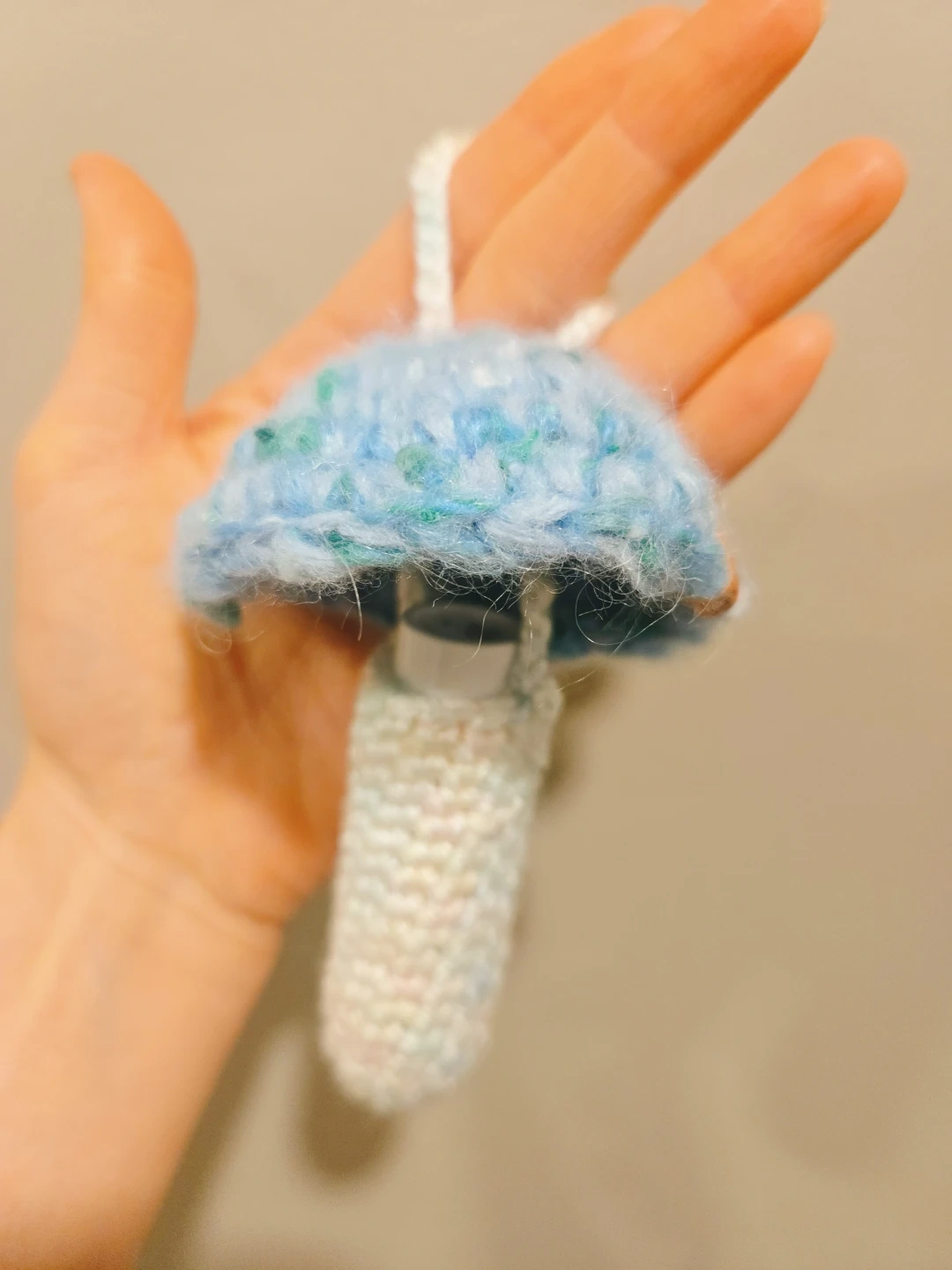 This handmade lip balm case is not only adorable but also a practical accessory, perfect for keeping your lip balm handy! Crafted with care, this case features a charming mushroom design with a delightful blue cap and a cozy, crocheted texture. It's in new condition! It would look perfect hang on to your purse or backpack.
