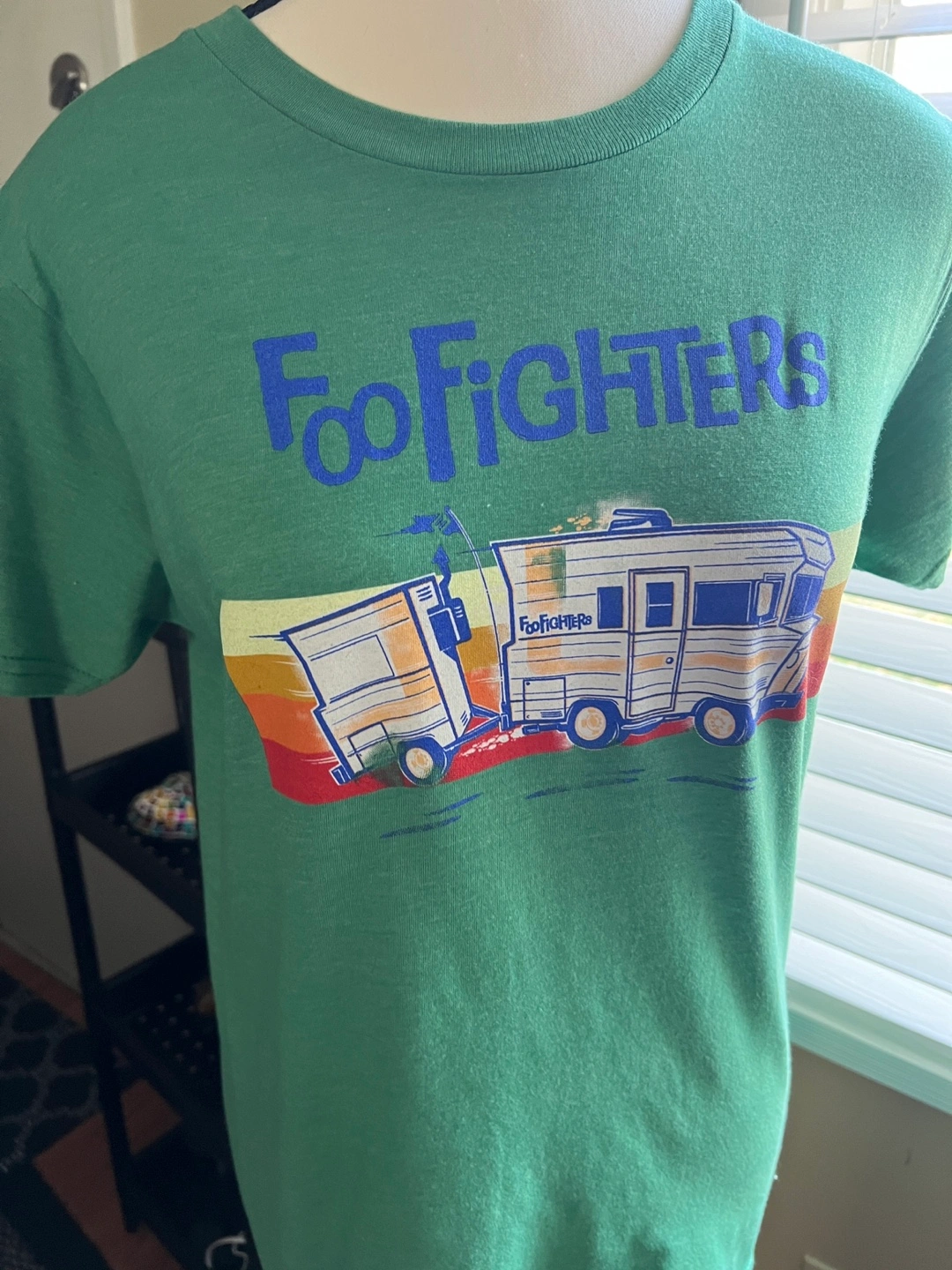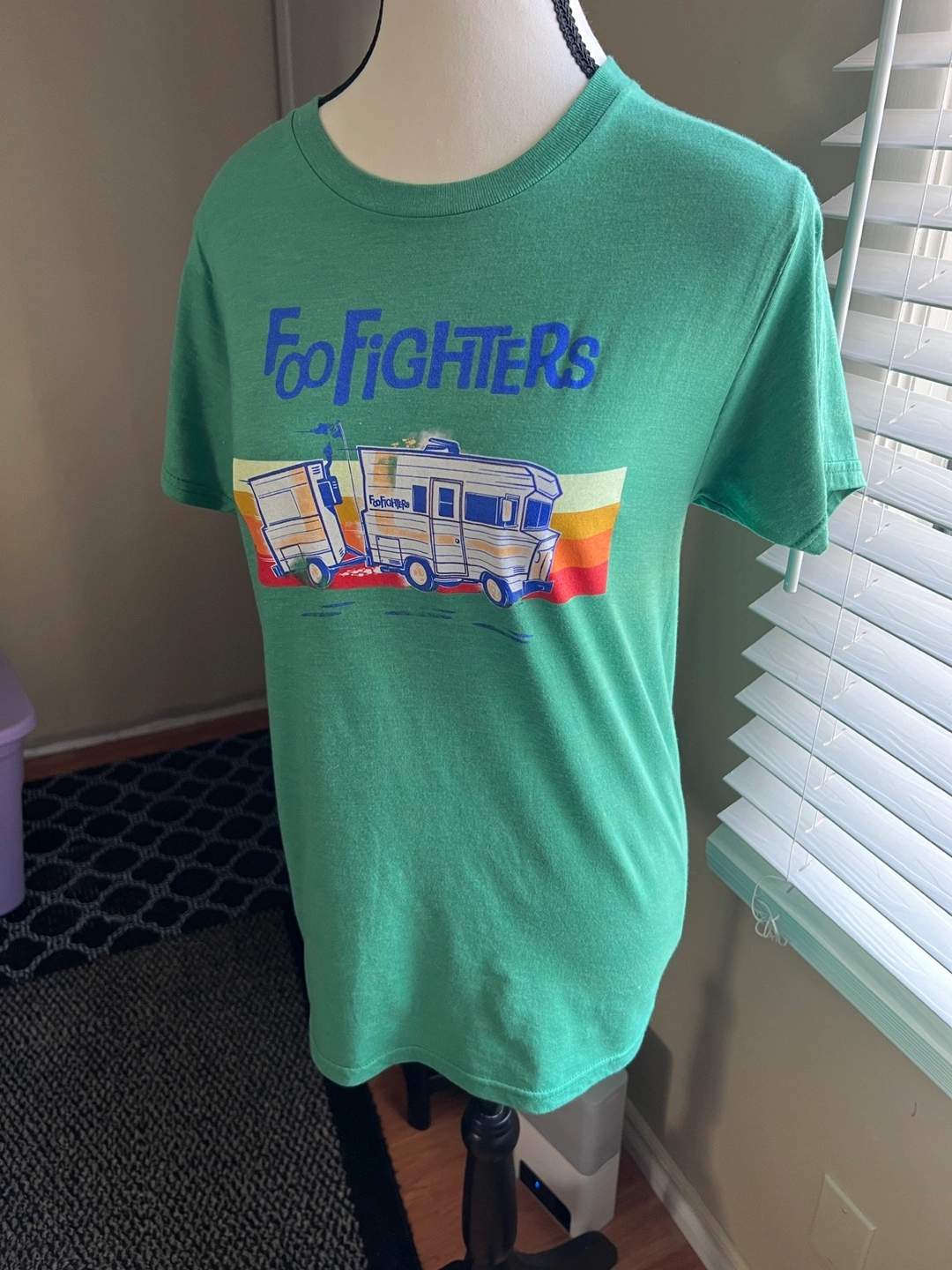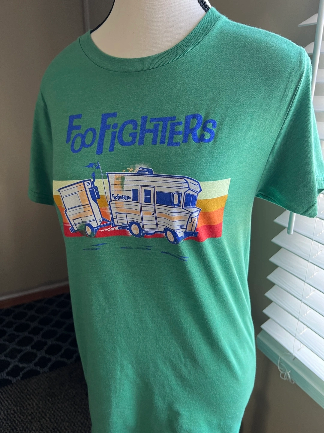 Green Foo Fighters T-shirt with a camper van graphic. Short sleeve, crew neck.