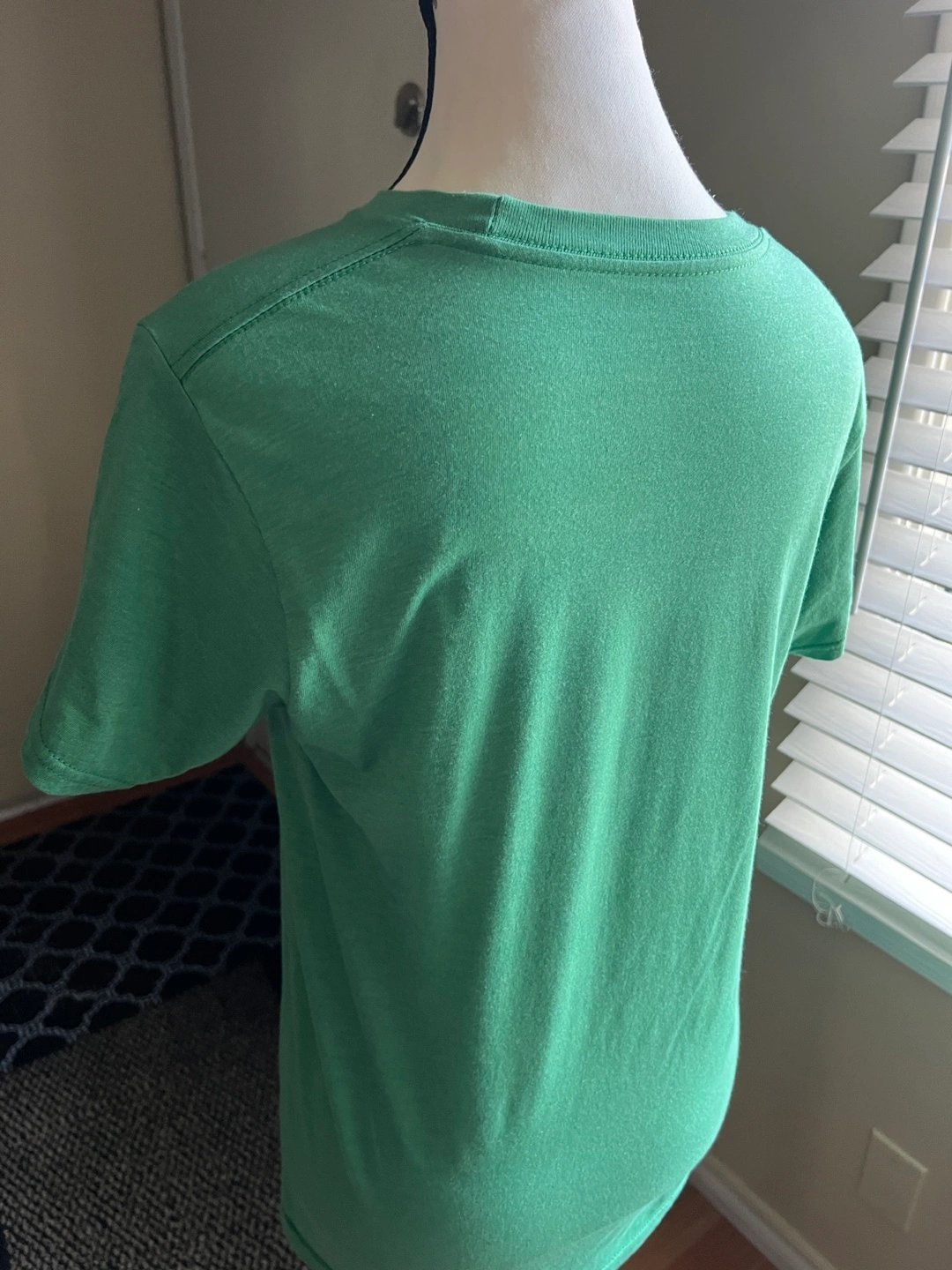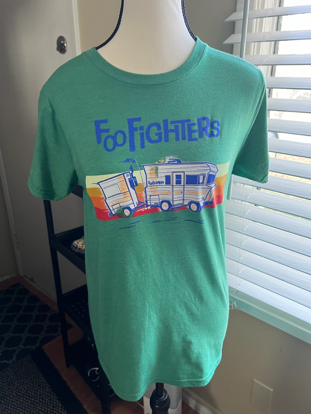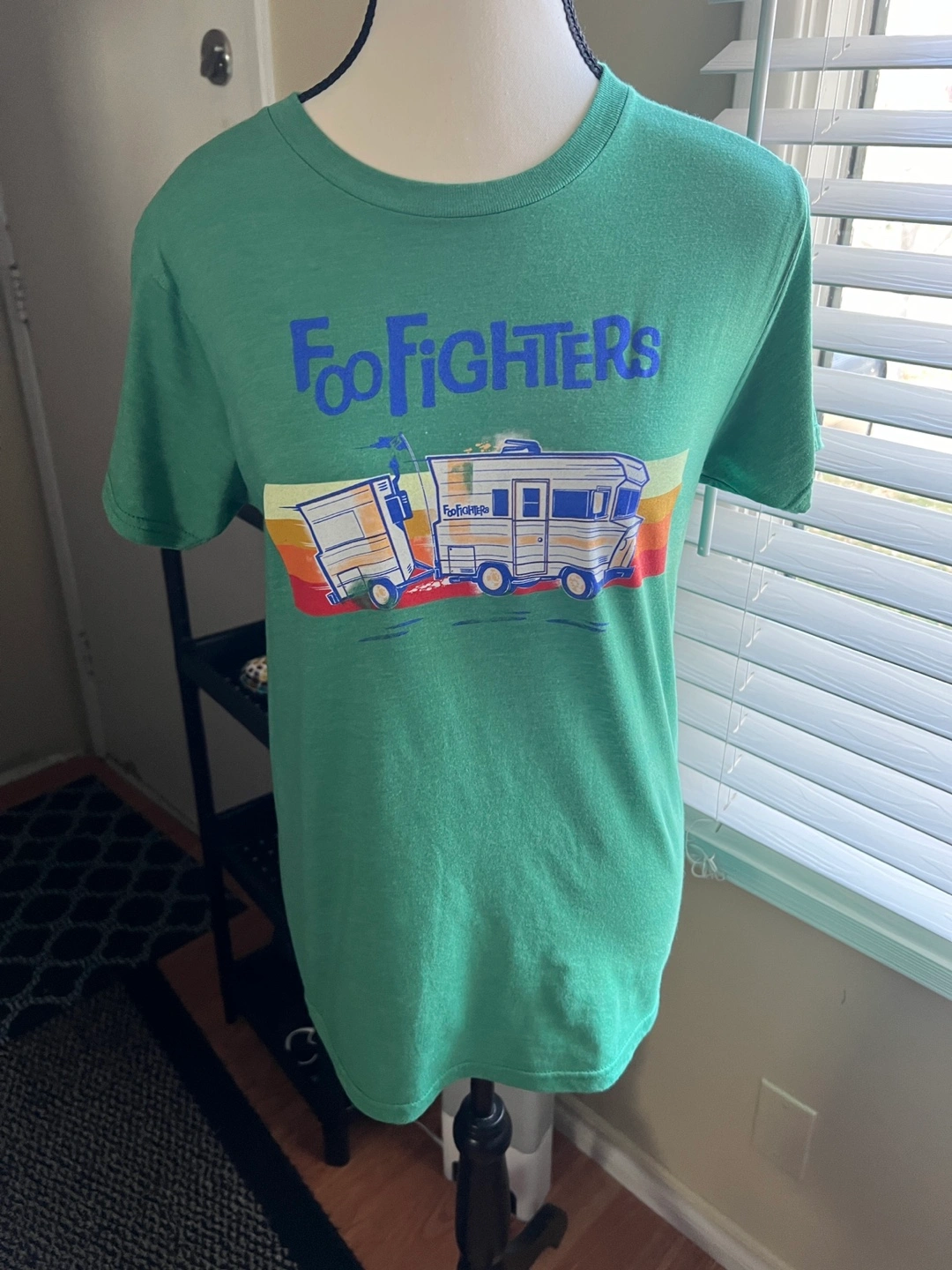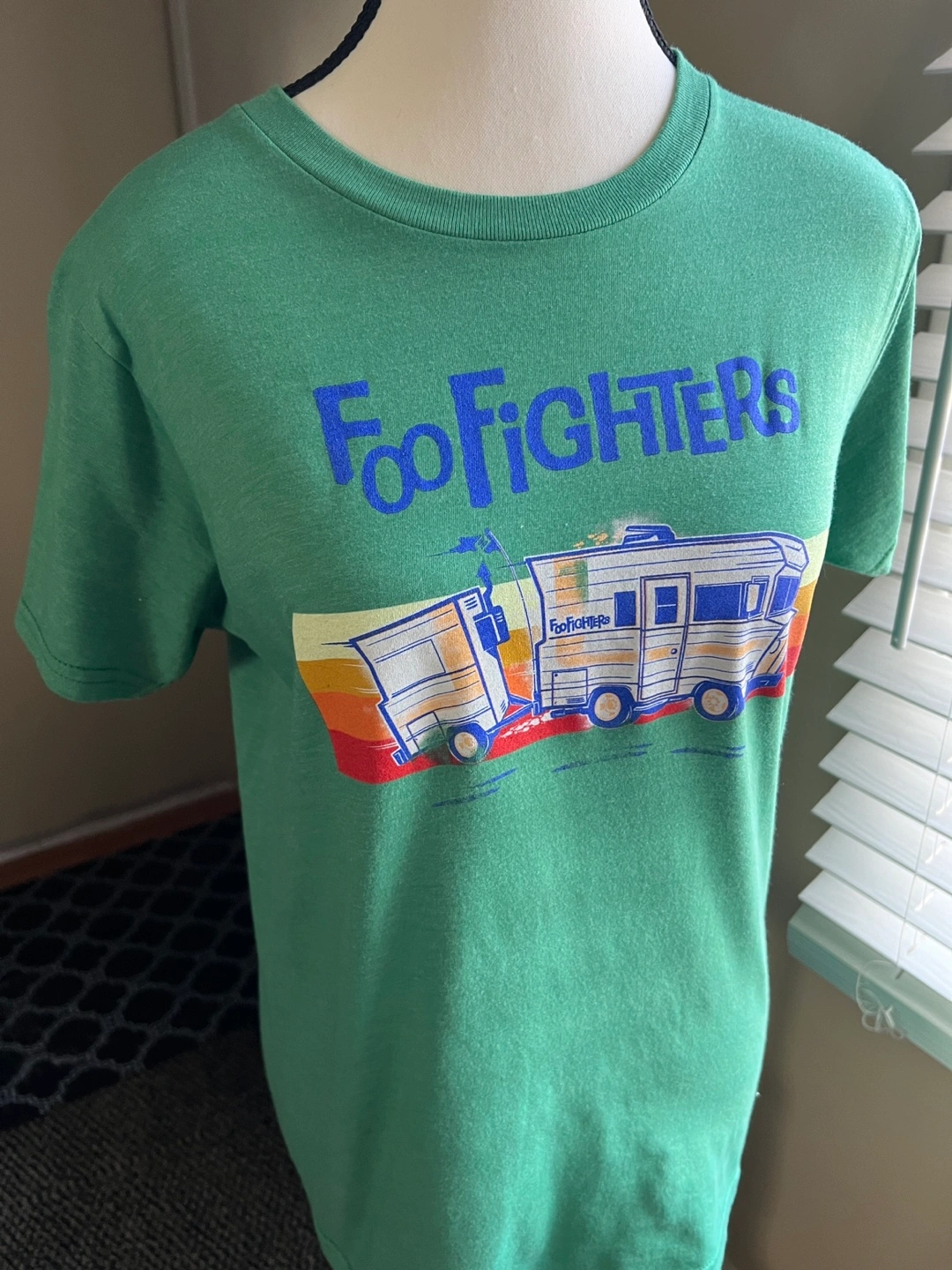 Green Foo Fighters T-shirt with a camper van graphic. Short sleeve, crew neck.