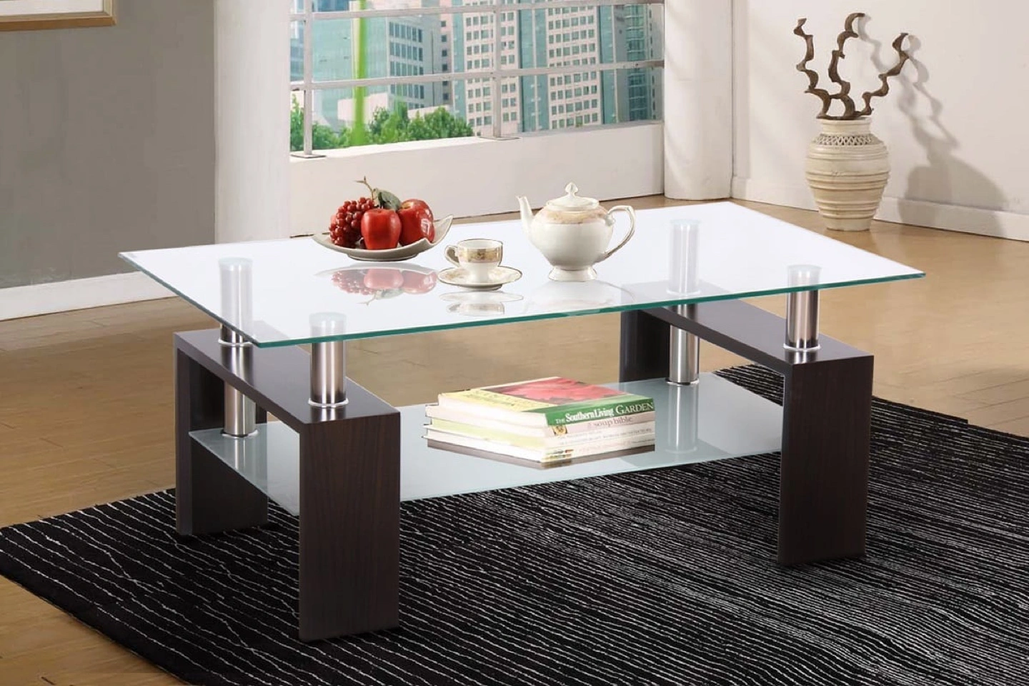 21Glass coffee table with a shelf, wood legs and metal accents.