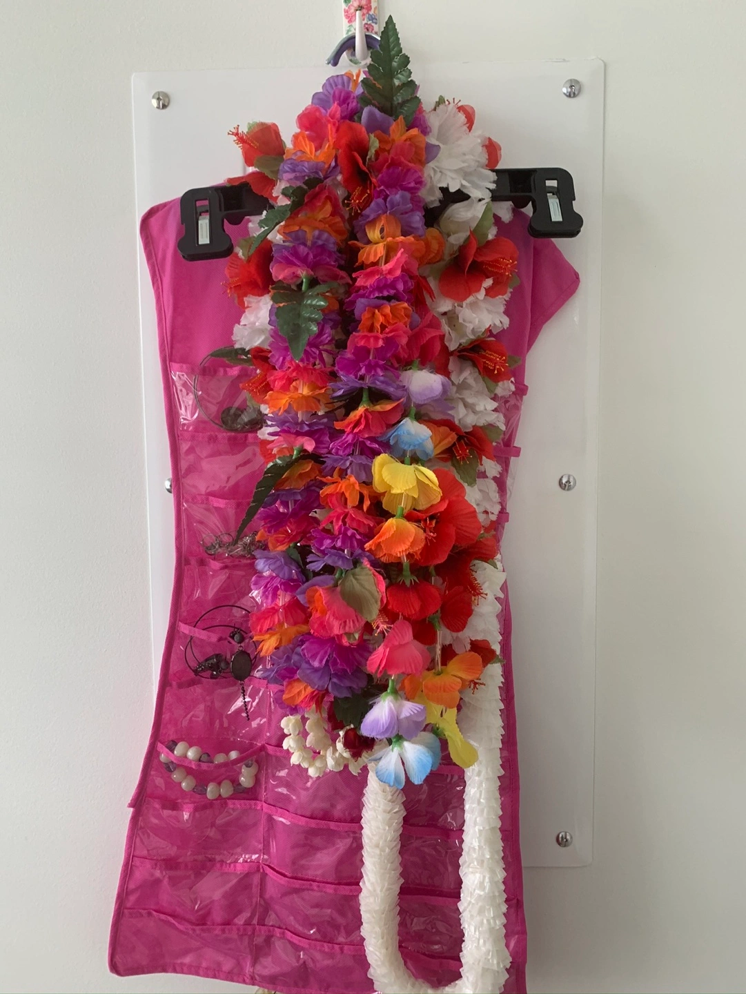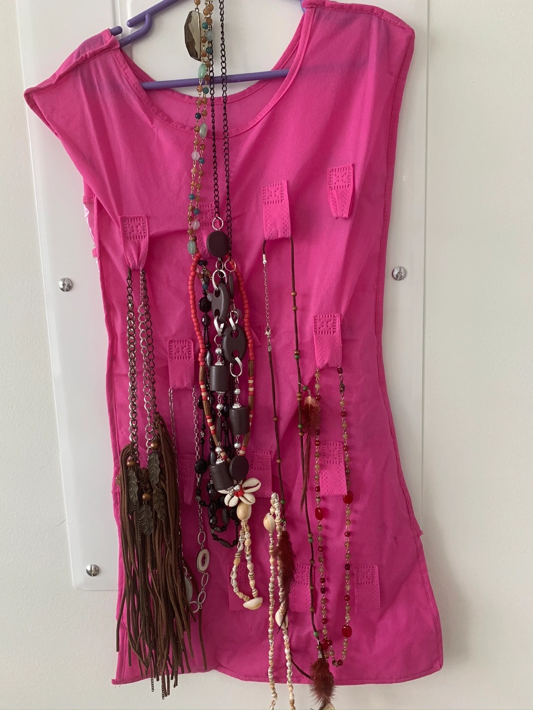 Pink hanging jewellery organizer. Holds necklaces, bracelets, rings, and earrings. Excellent for organizing and storing your jewellery.