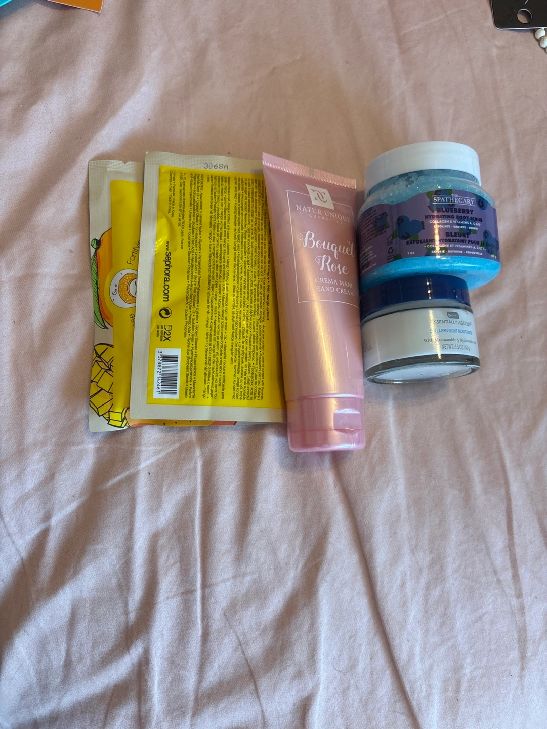 Bundle of three beauty products including a hand cream, body scrub, and night moisturizer. All products are new and unopened.