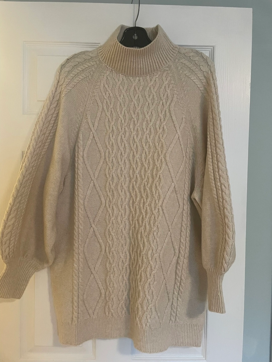 20Cream cable knit long sweater with mock neck and long sleeves. Size medium. Looks great with leggings or tides. New without tags