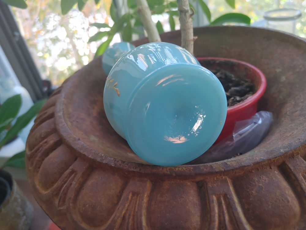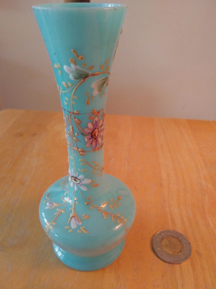 Small, blue opalescent glass vase with gold and white floral details. It has some minor wear and tear, but is in good condition.