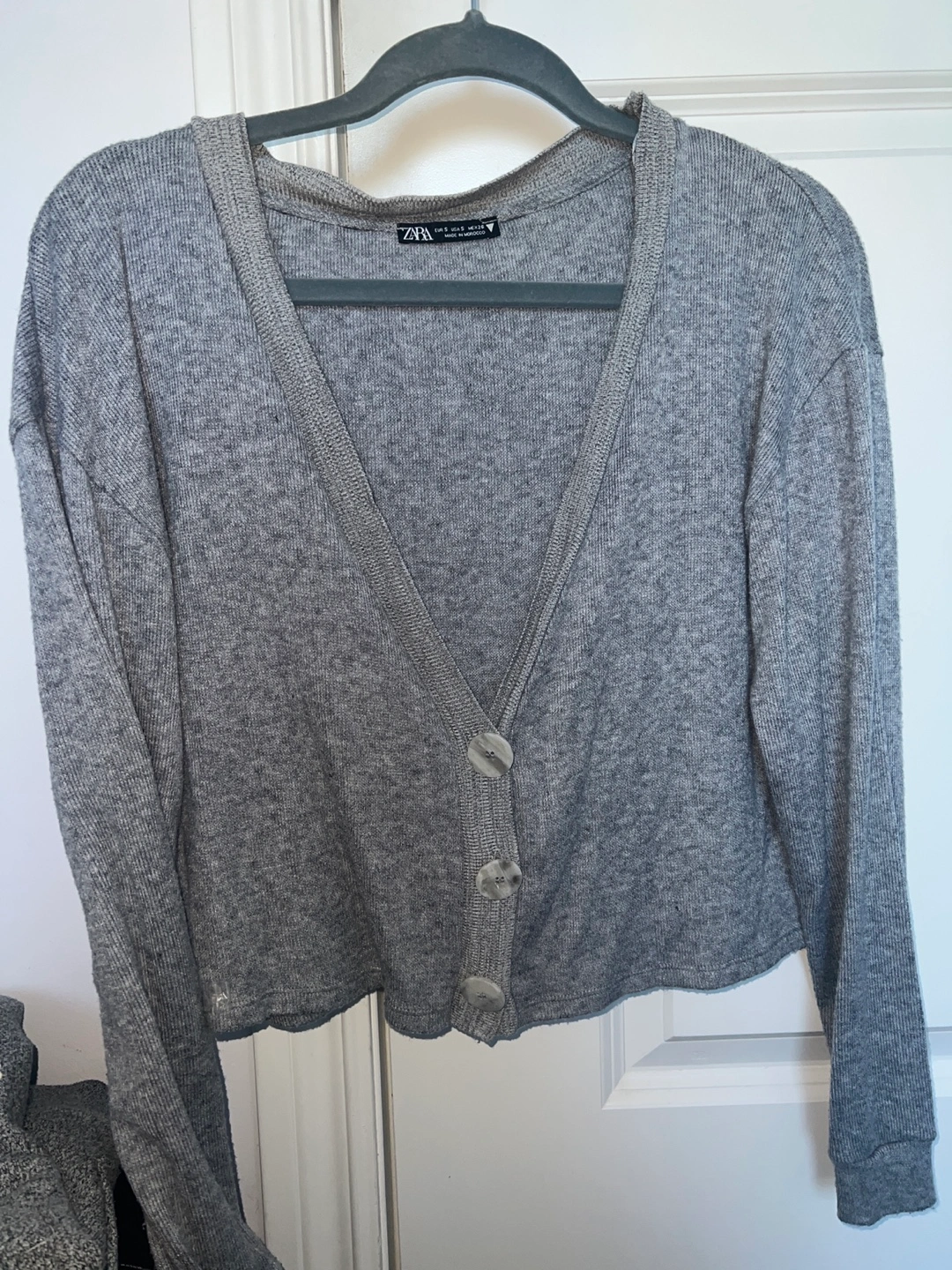 Grey cropped cardigan with long sleeves and button closure. V-neck. Size small but it’s very stretchy Pick up downtown only