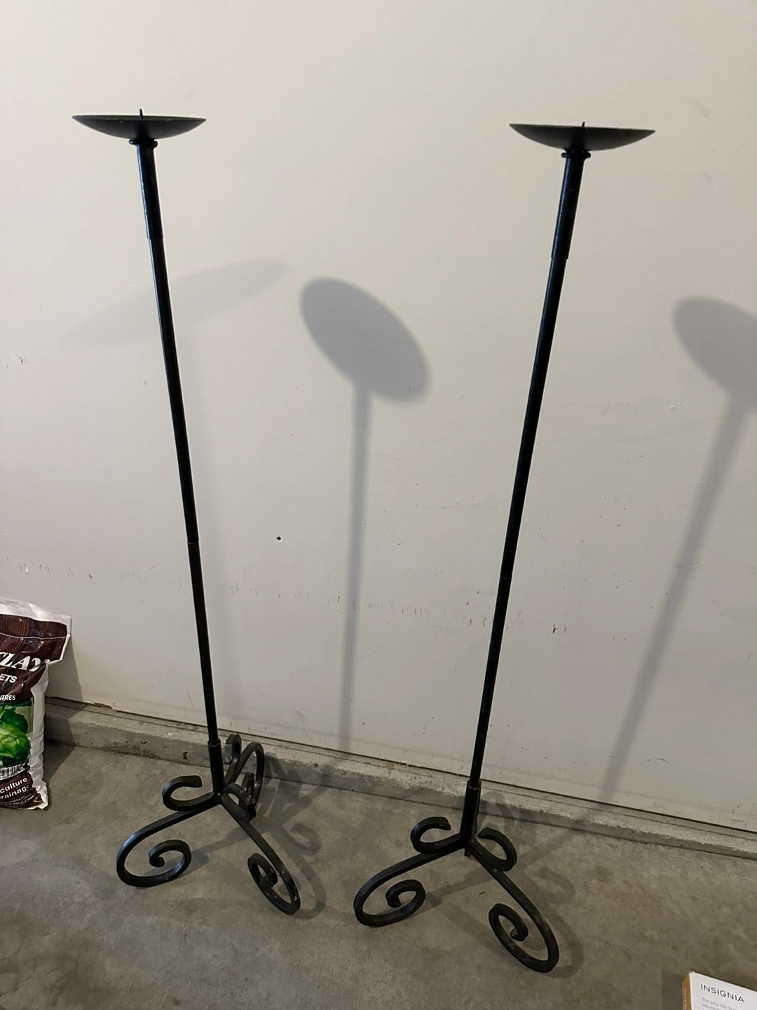 Set of two tall black metal candle holders. Each with a three-pronged top and a scrolled base and a 3 candlelight holders all sold together.