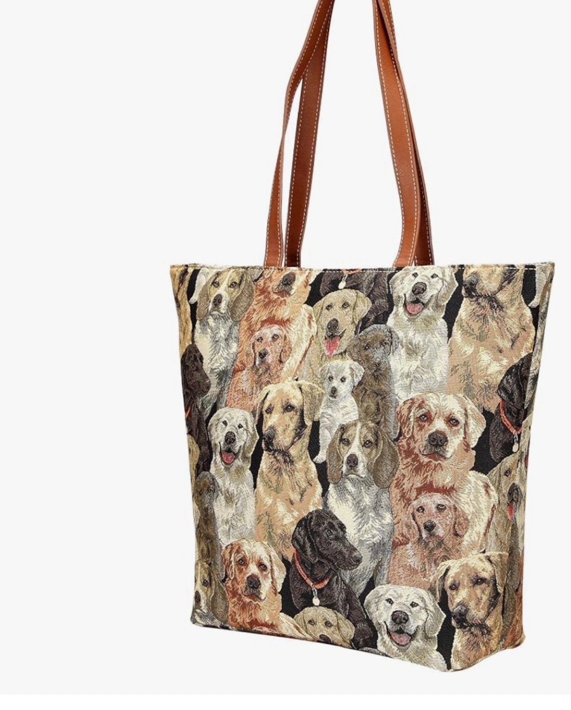 464Large tote bag with a dog pattern. Features brown leather straps and a zipper closure. Includes inner pockets.
