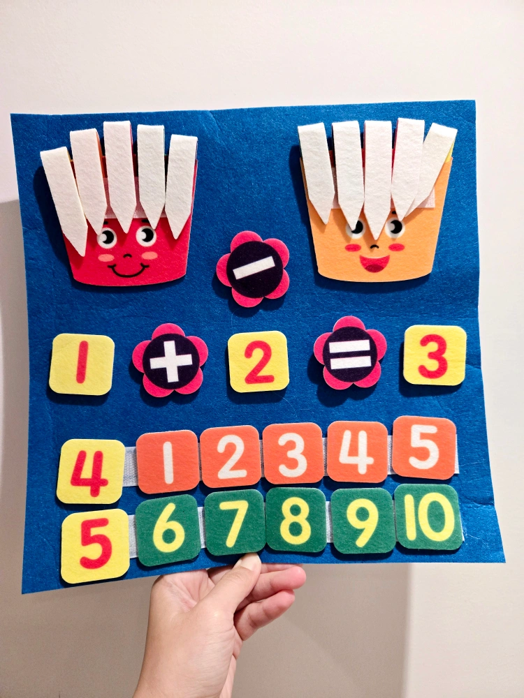 Felt board with numbers 1-10, plus and minus symbols and two containers. Can be used for learning basic math concepts.
