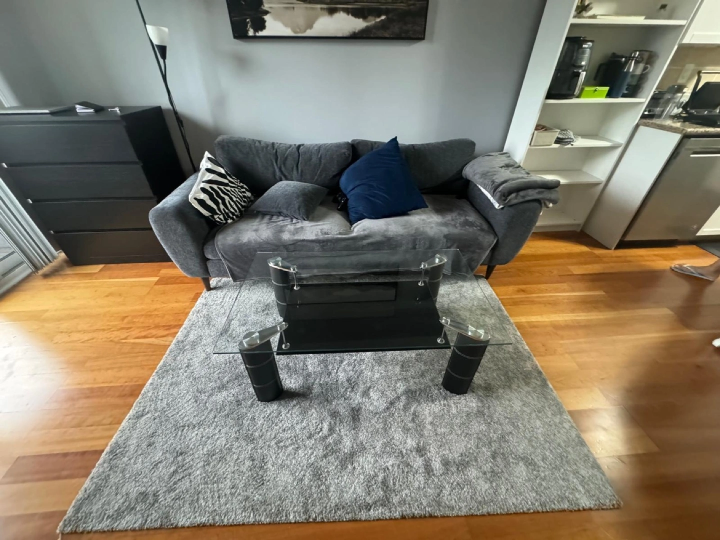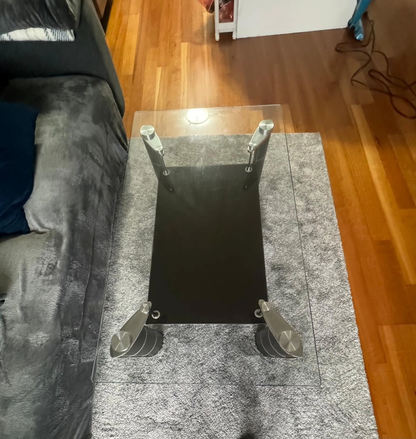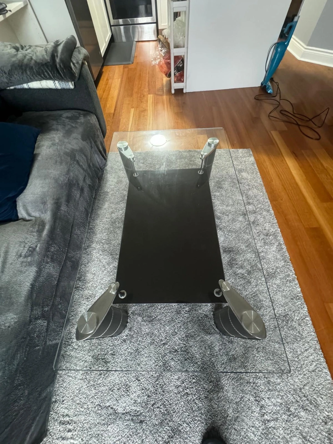 For sale: Elegant, almost-new glass center coffee table in excellent condition. Features a sleek glass top with leather legs, adding a modern touch to any living space. No scratches or signs of wear—perfect for enhancing your home décor.