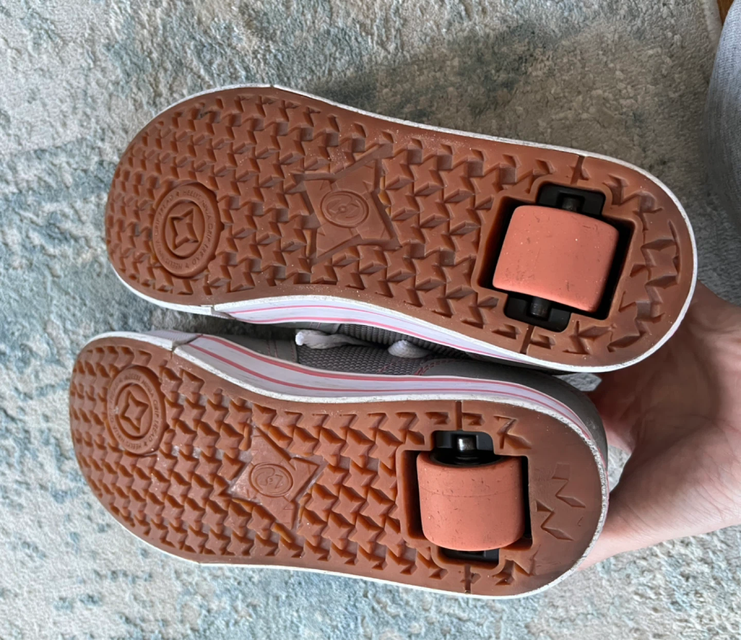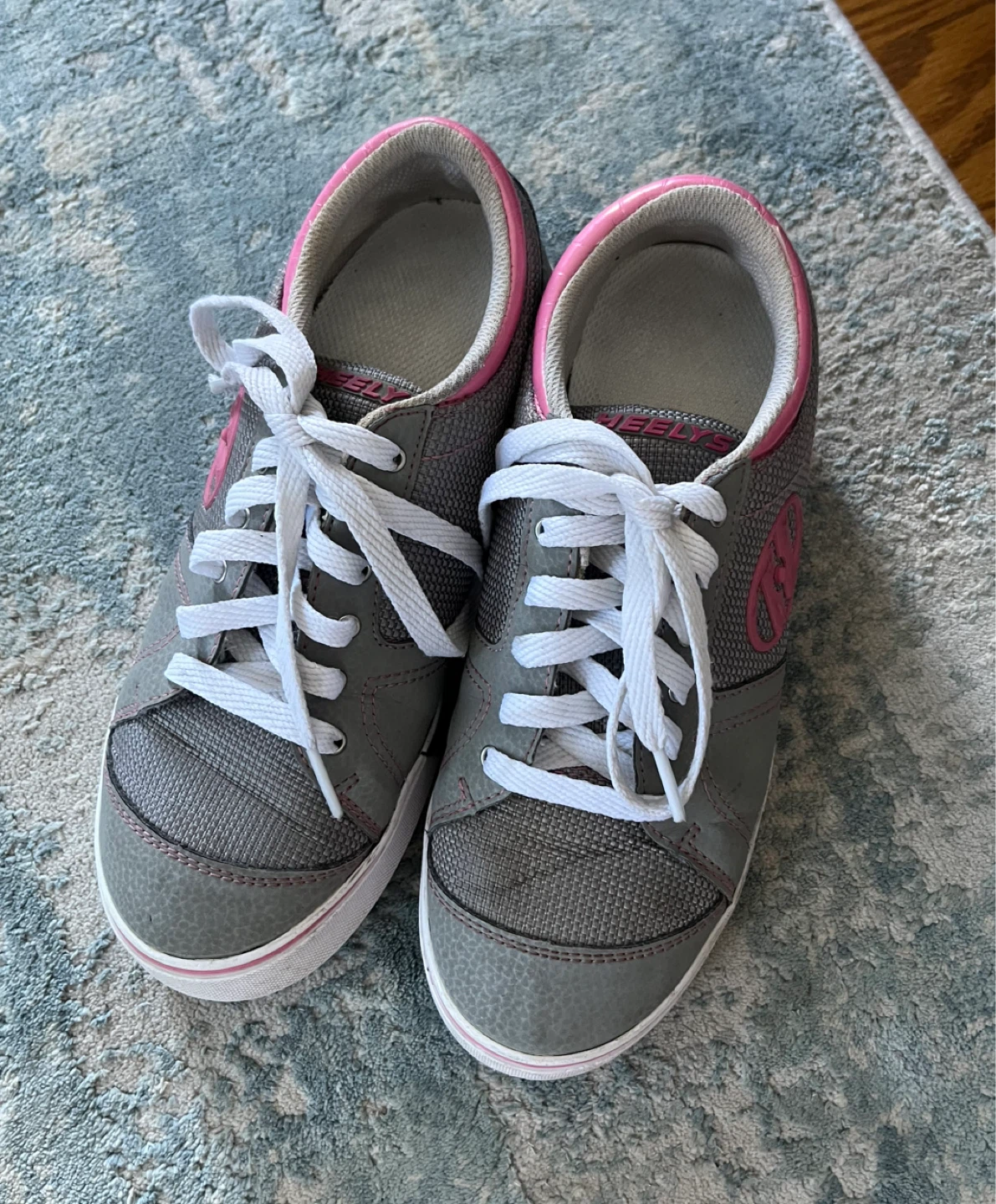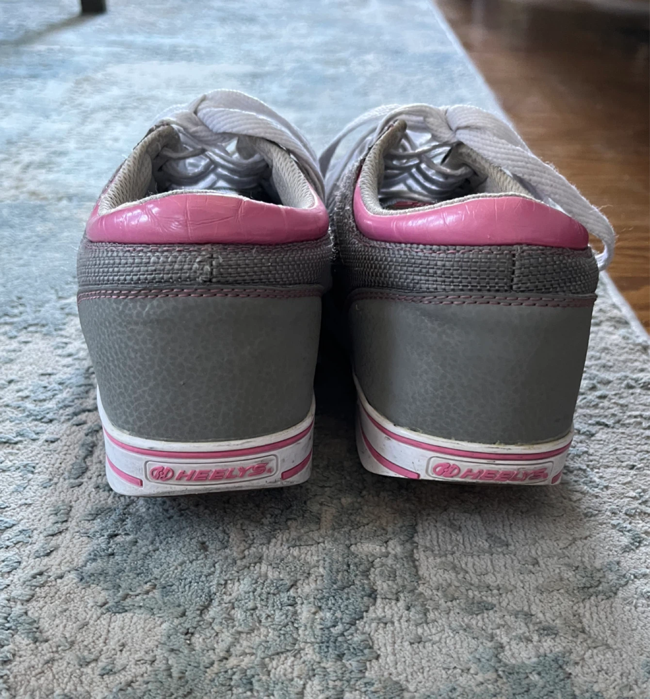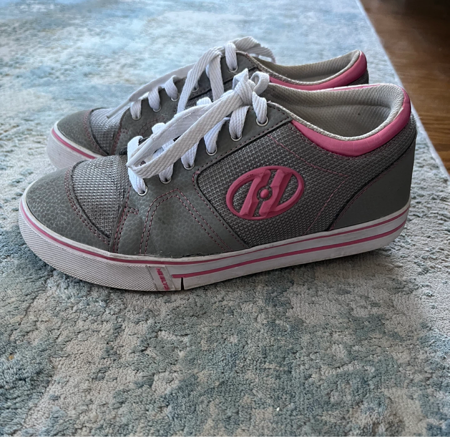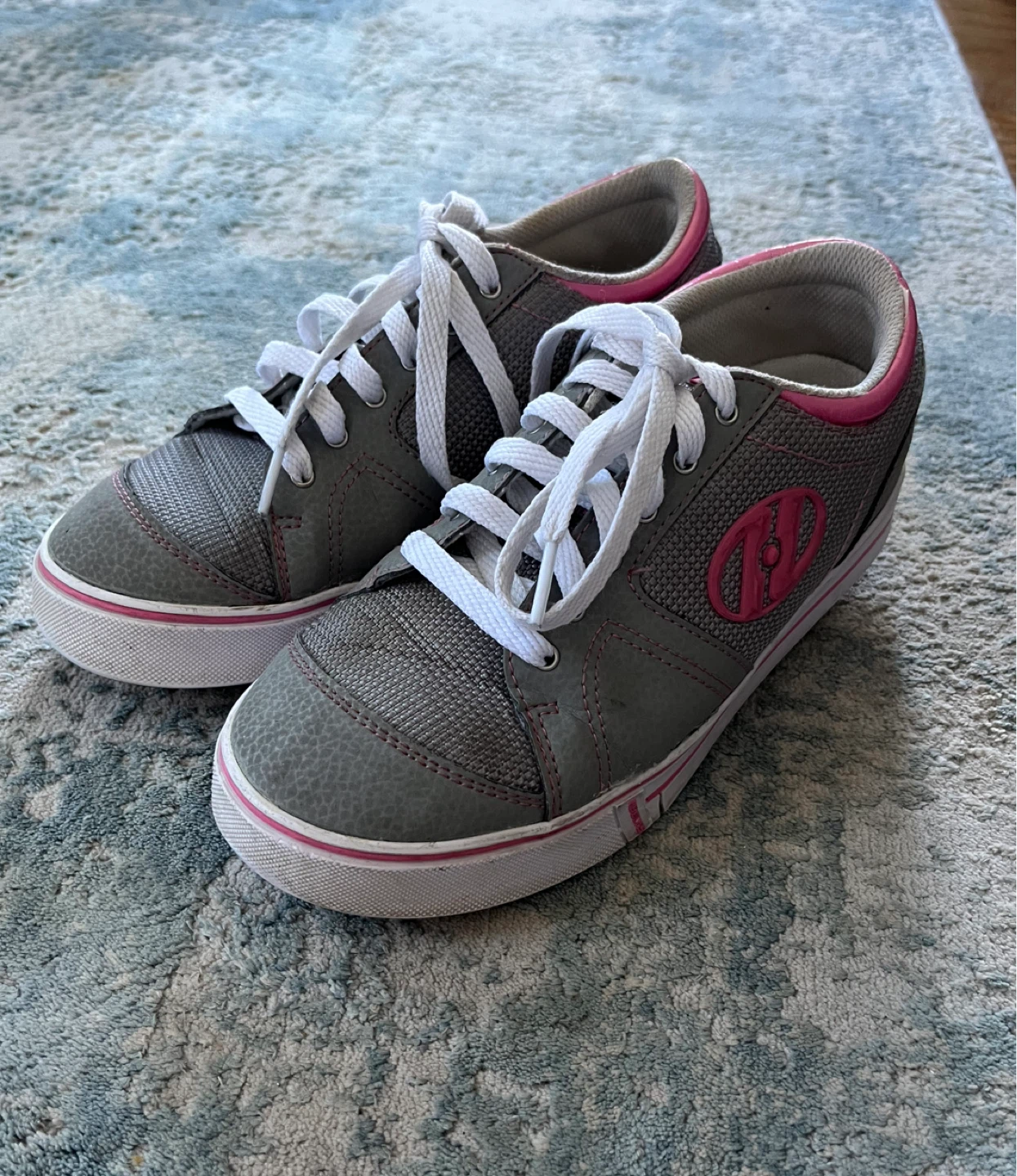 Grey Heelys with pink accents. These shoes have laces for a secure fit. They're great for people who love to roll!