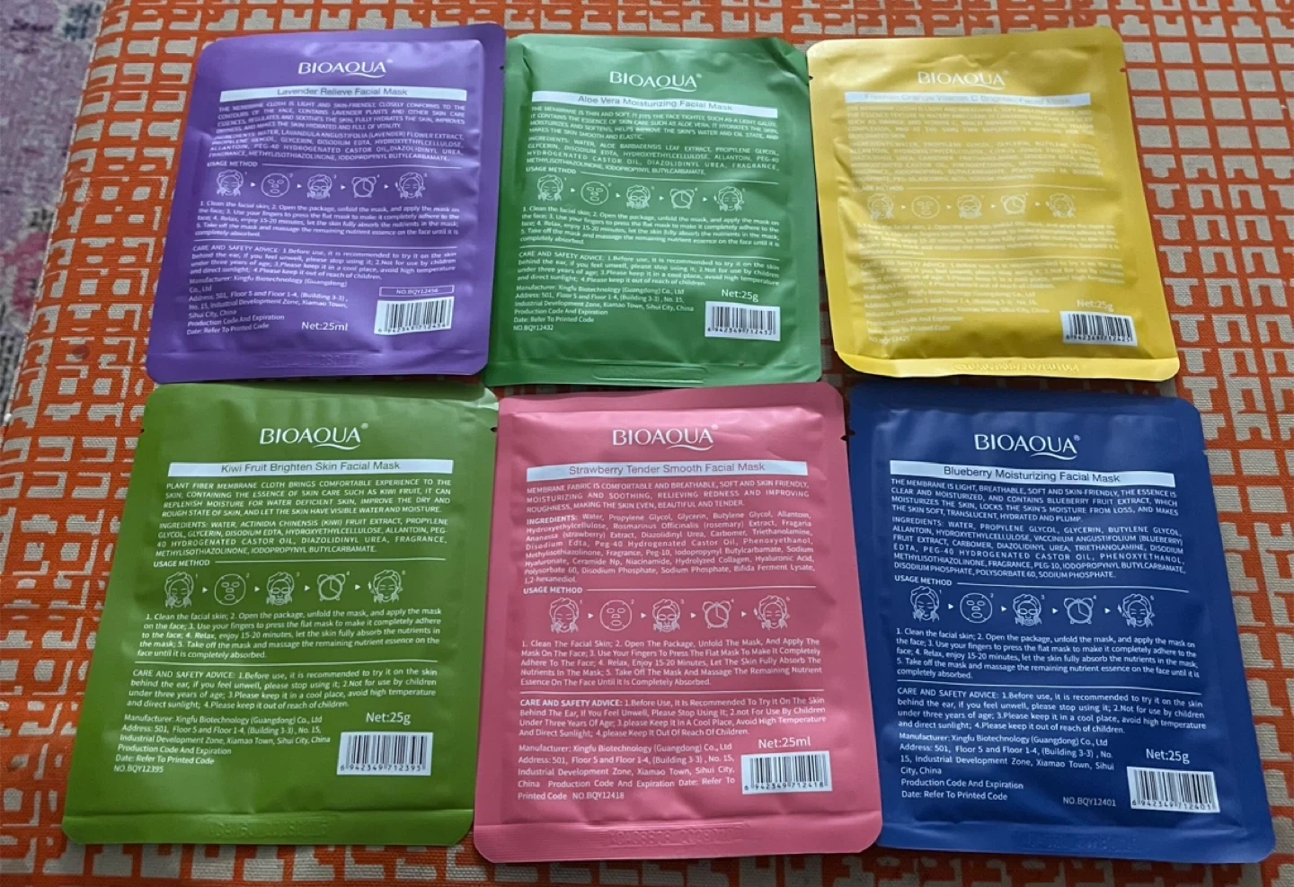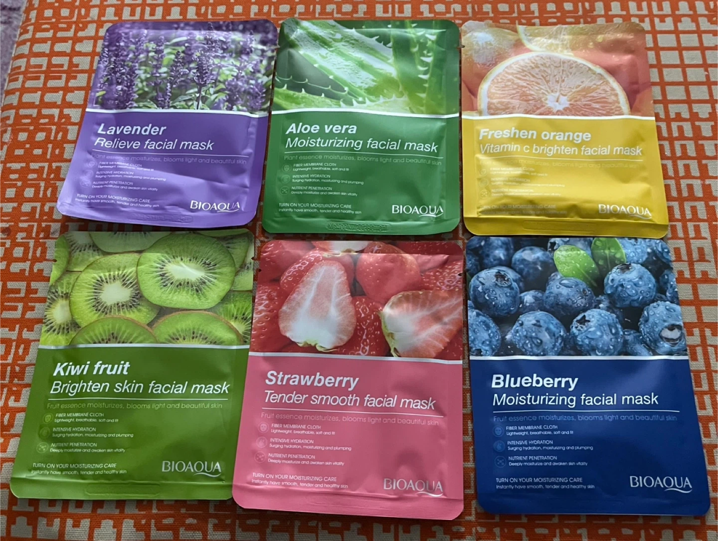 A set of BIOAQUA tender smooth facial masks with various fruit essences. These masks are made with fiber membrane cloth for intensive hydration. They're designed to make skin smooth, tender, and healthy.