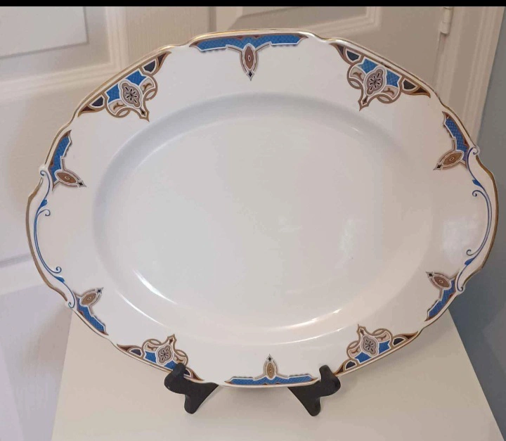 486Large oval serving platter with blue and gold trim. Measures approximately 15 inches in length. I bought it 1994 it's older than that year. If you want, you can decorate your home or use it as a service plate. The plate holder is not included.