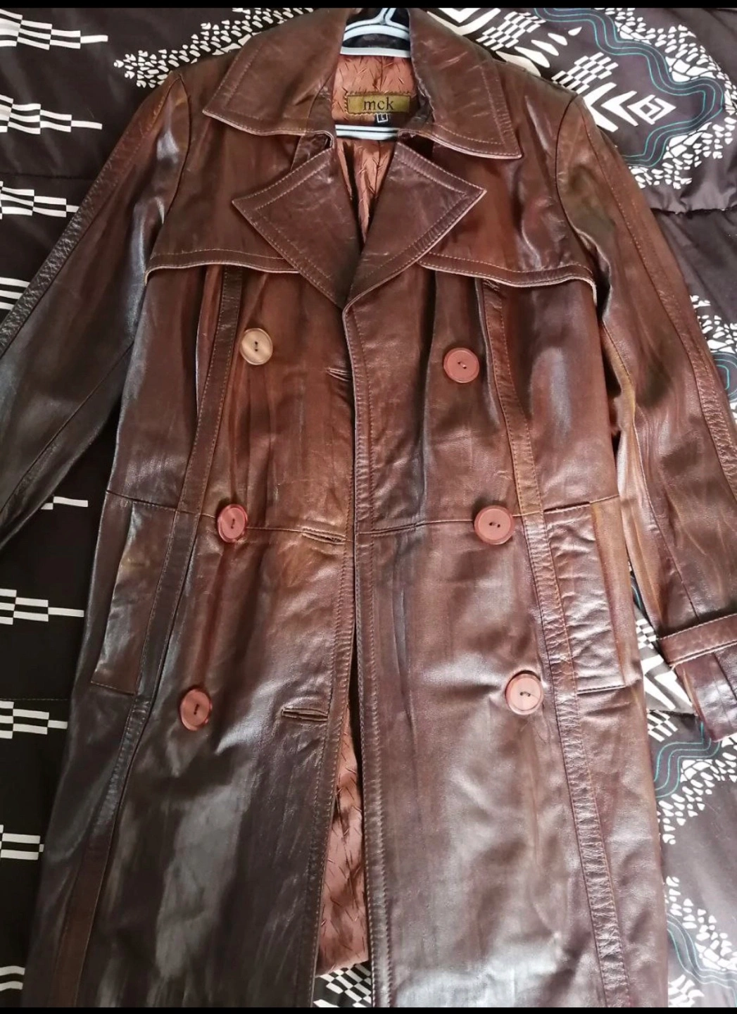 Brown leather trench coat with a double-breasted closure, has pockets on the sides. Good quality genuine leather ladies coat, purchased in Turkey, very stylish long jacket, approximately to knee high, for an average height woman. Only worn a few times. Suitable for autumn or mild winter season.