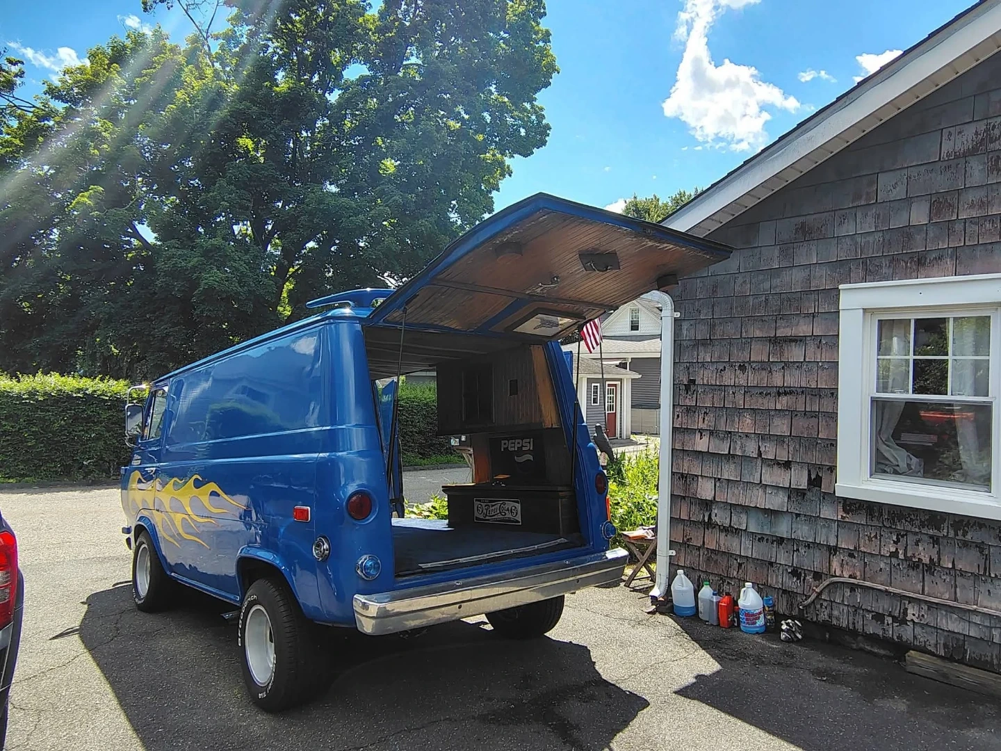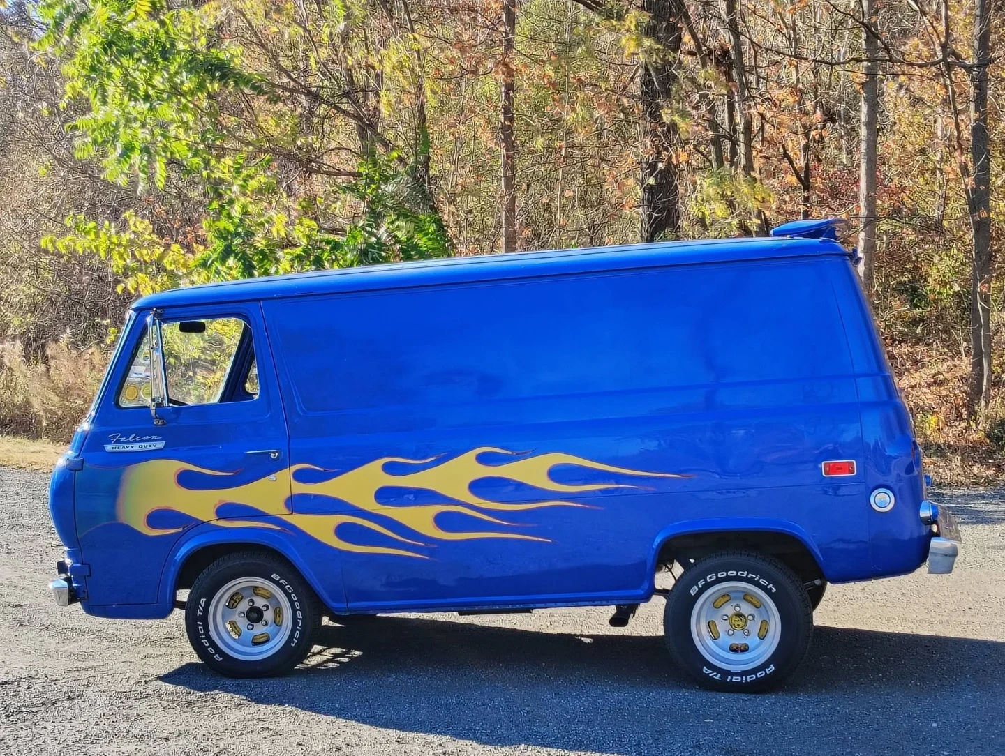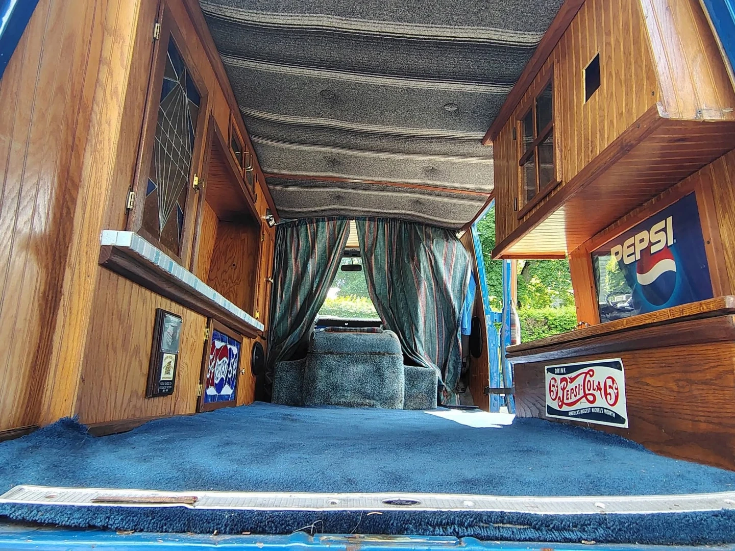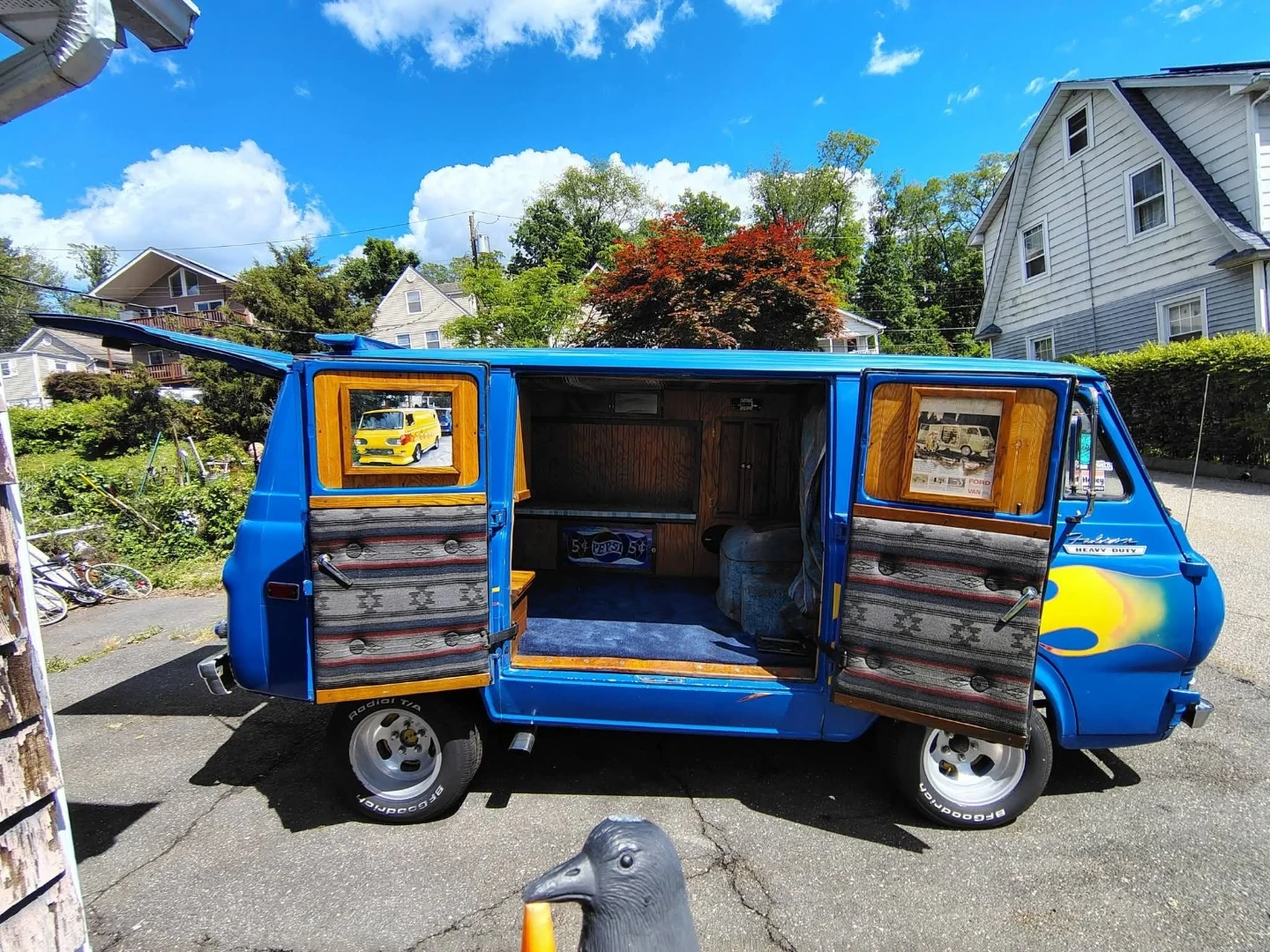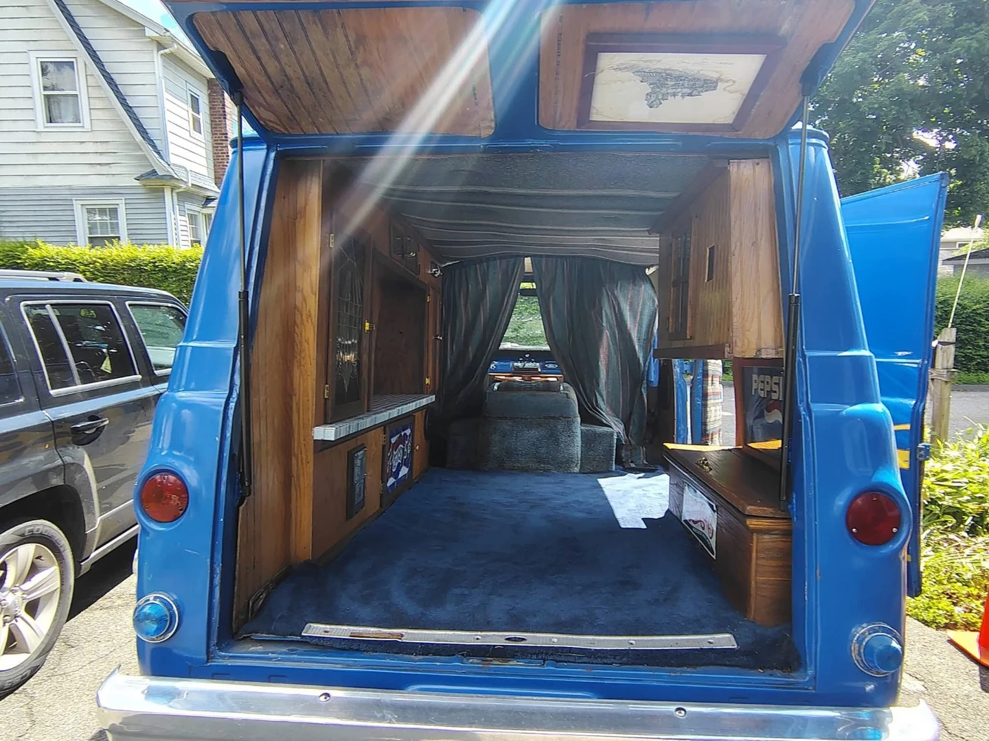 Selling a blue Ford Econoline custom van. It has custom interior and exterior paint. The van has custom wheels and tires. Motor 400M