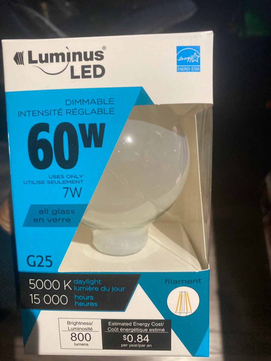 Dimmable LED light bulb. 7W, 5000K daylight, 15,000 hours, all glass. G25 size. Energy Star certified.
