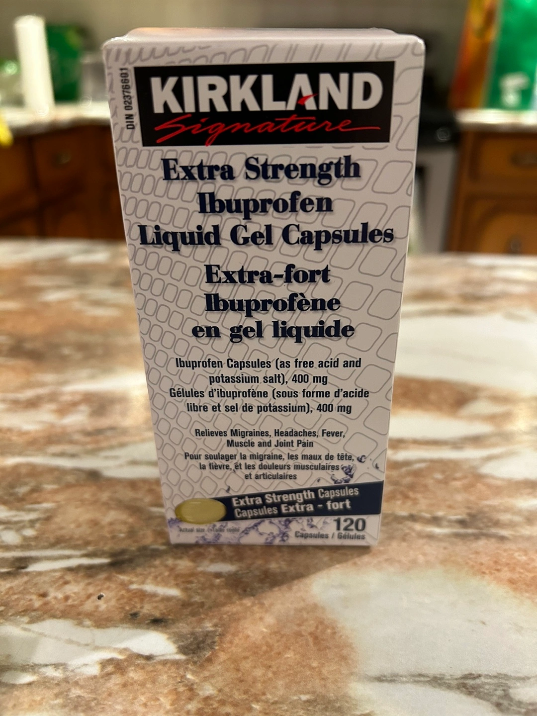 Extra-fort ibuprofen in liquid gel capsules, 400mg. Relieves migraines, headaches, fever, muscle and joint pain.